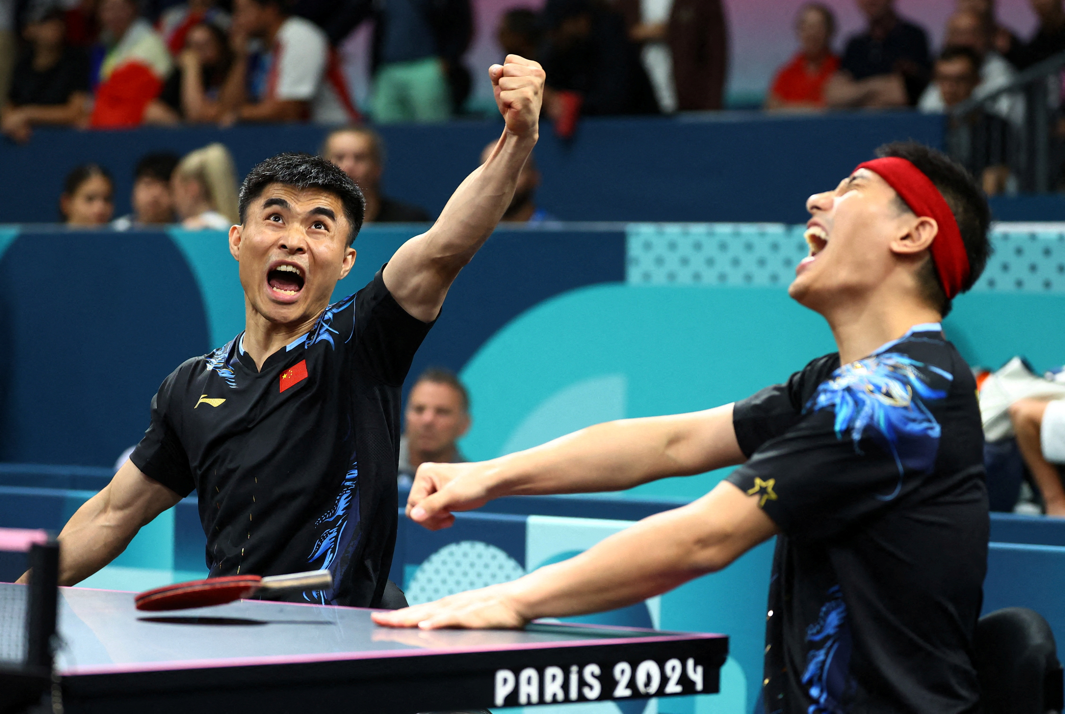Ningning Cao and Panfeng Feng of China react during their match against Wanchai Chaiwut and Yuttajak Glinbancheun of Thailand during men's table tennis doubles MD8 semifinals in Paris, France on August 30, 2024. (Photo by Kacper Pempel/Reuters)