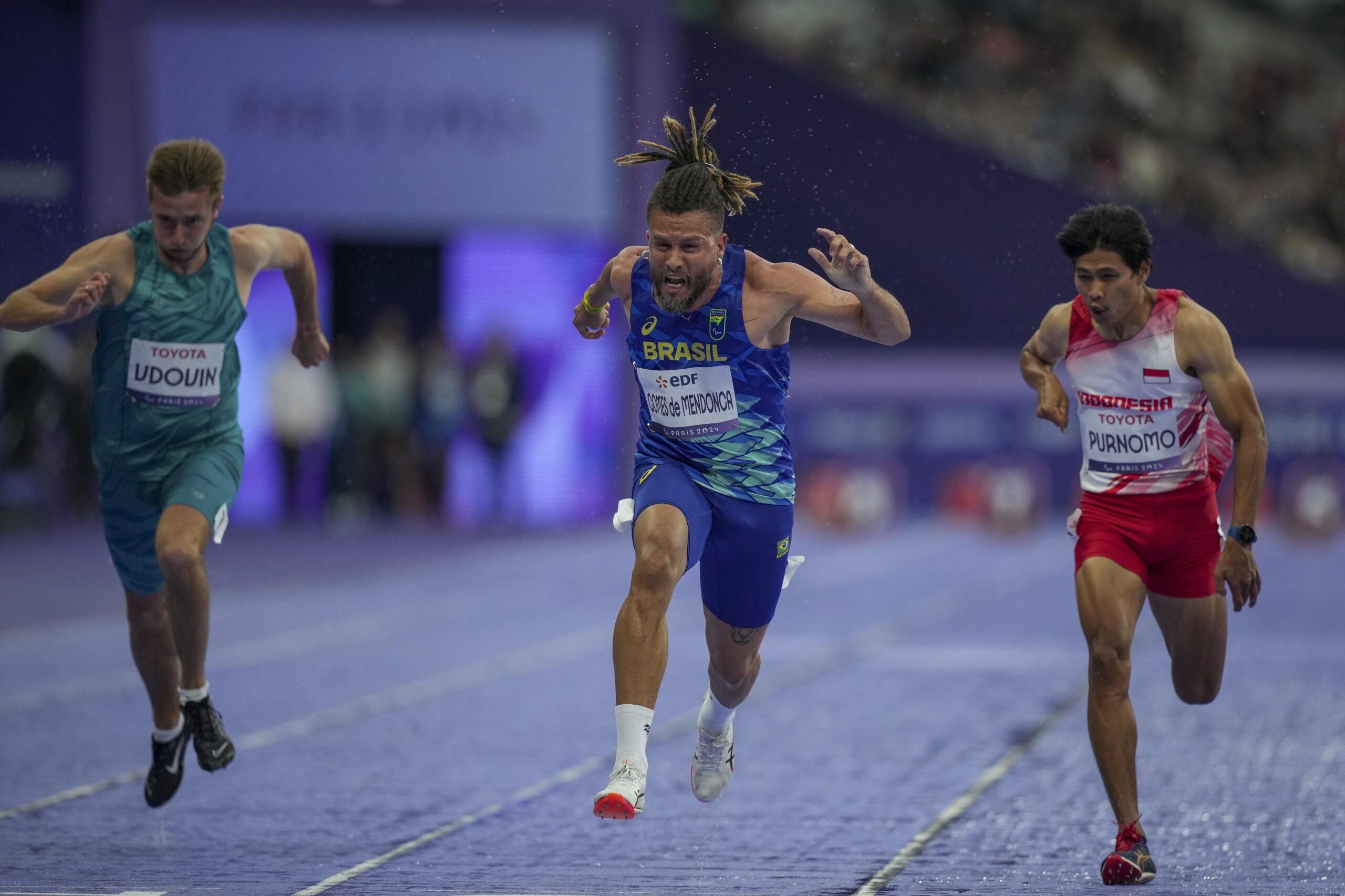 Brazil's Ricardo Gomes de Mendonca leads the men's 100m T37 race at the 2024 Paralympics, Friday, August 30, 2024, in Paris, France. (Photo by Emilio Morenatti/AP Photo)