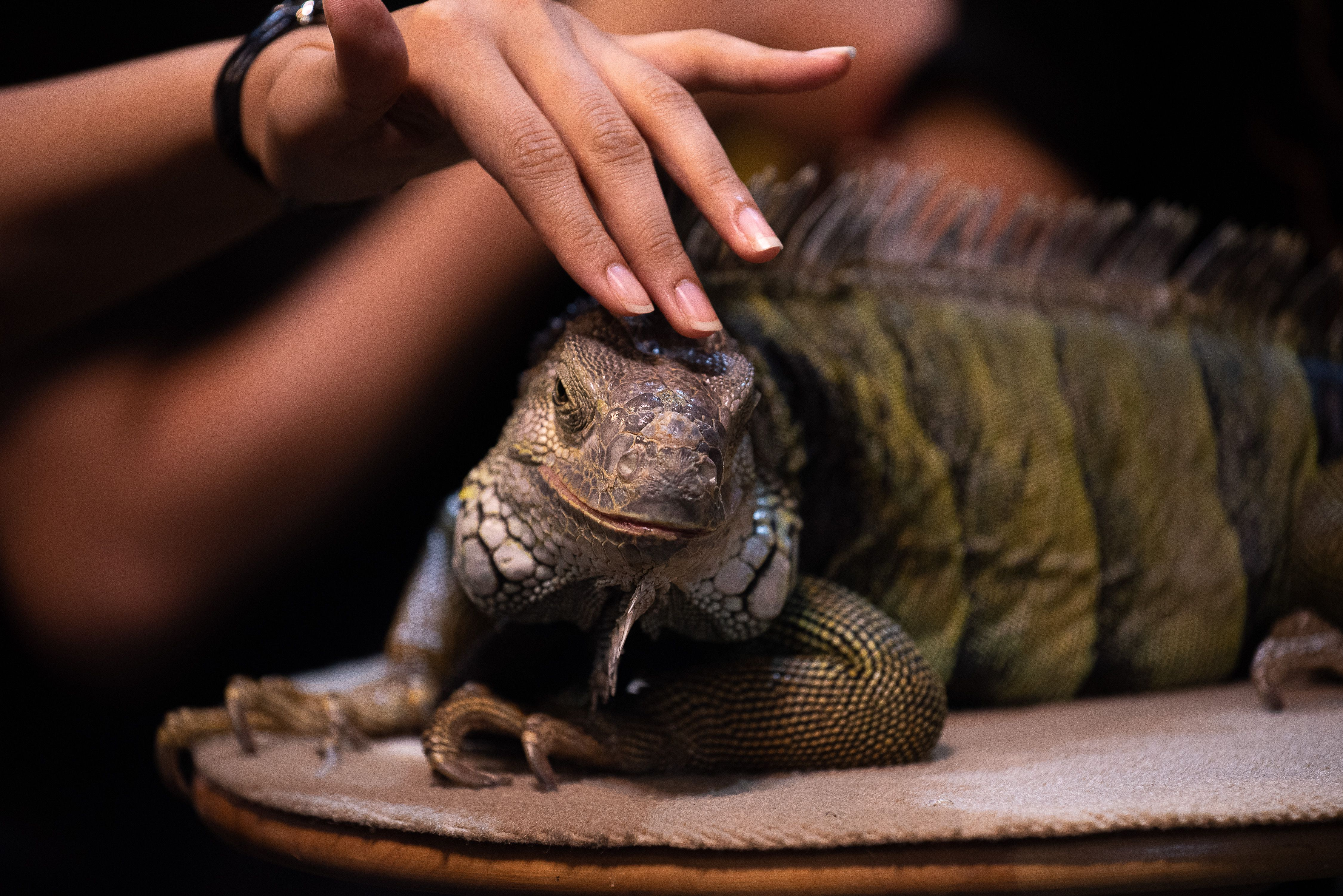 A visitor seen touching an Iguana during the Thailand Reptile and Exotic Pet Expo at Central Ladprao the shopping mall in Bangkok on August 3, 2024. (Photo by Peerapon Boonyakiat/SOPA Images/Rex Features/Shutterstock)