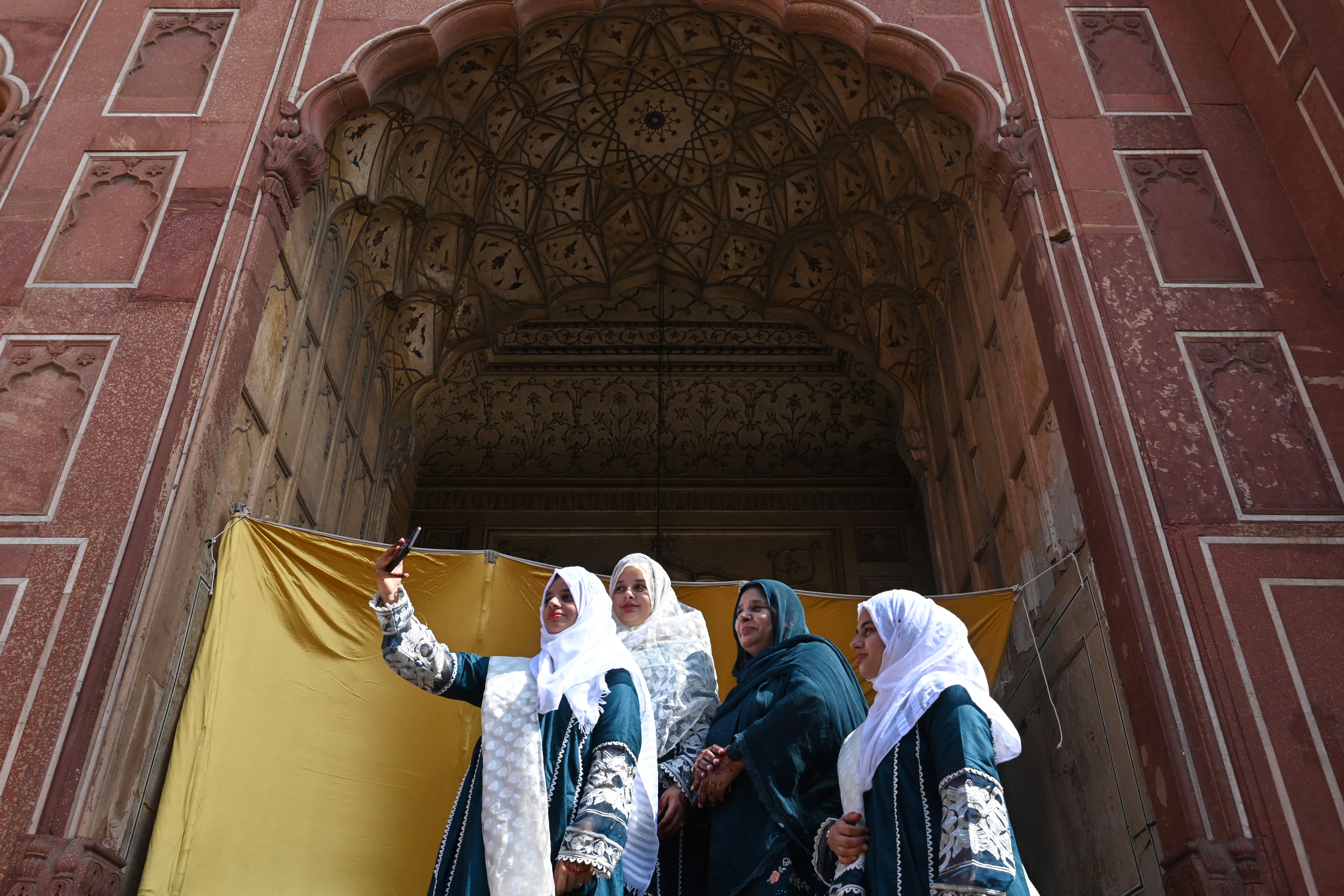 Women takes a selfie after offering prayers at the Badshahi mosque during the Eid al-Adha or the 'Festival of Sacrifice, in Lahore on June 17, 2024. (Photo by Arif Ali/AFP Photo)