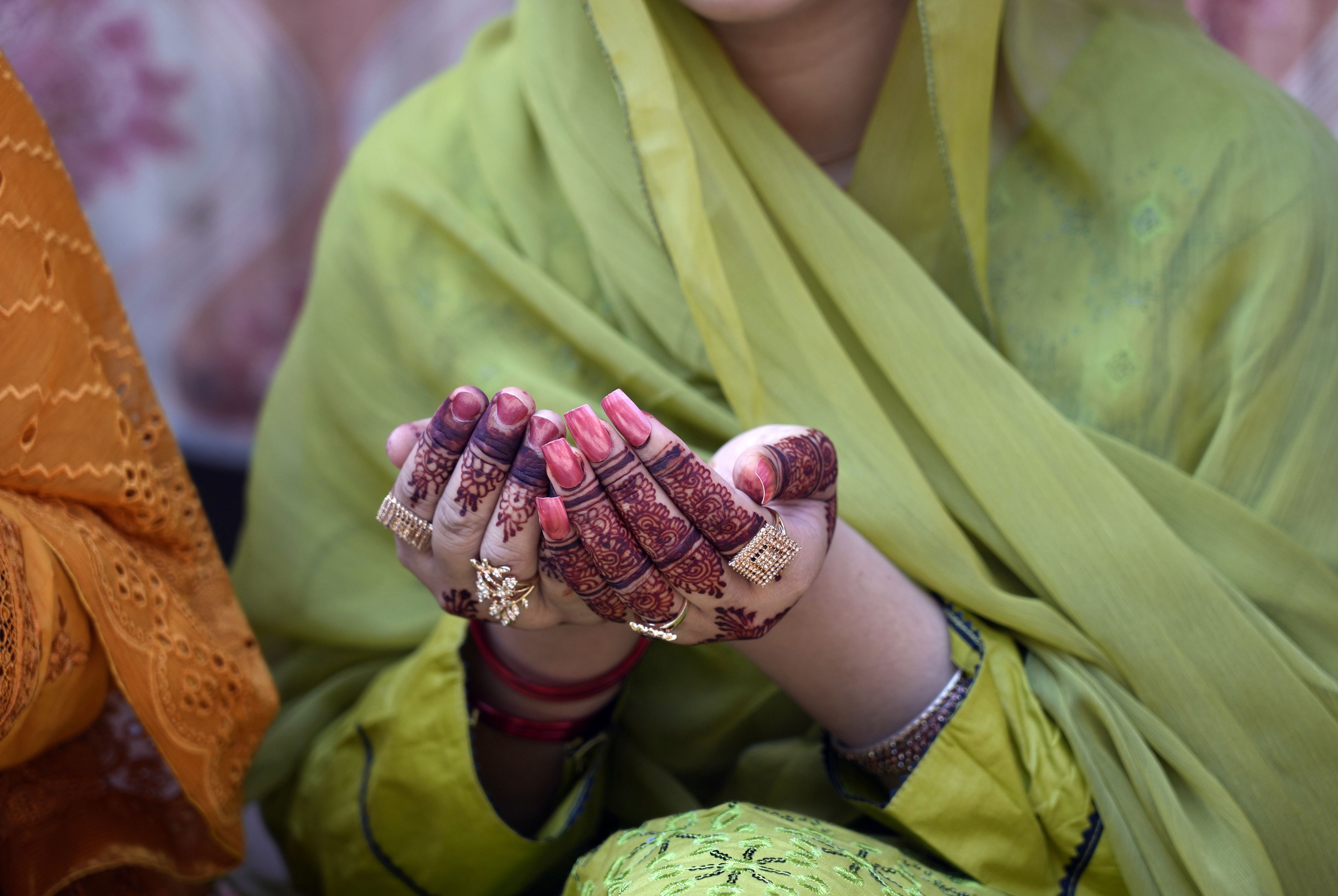 A woman has her hands painted with traditional henna as she attends Eid al-Adha prayers at historical Badshahi mosque in Lahore, Pakistan, Monday, June 17, 2024. Eid al-Adha or Feast of Sacrifice, the most important Islamic holiday, marks the willingness of the Prophet Ibrahim, Abraham to Christians and Jews, to sacrifice his son. During the holiday, which in most places lasts three days, Muslims slaughter goat, sheep or cattle, distribute part of the meat to the poor. (Photo by K.M. Chaudary/AP Photo)