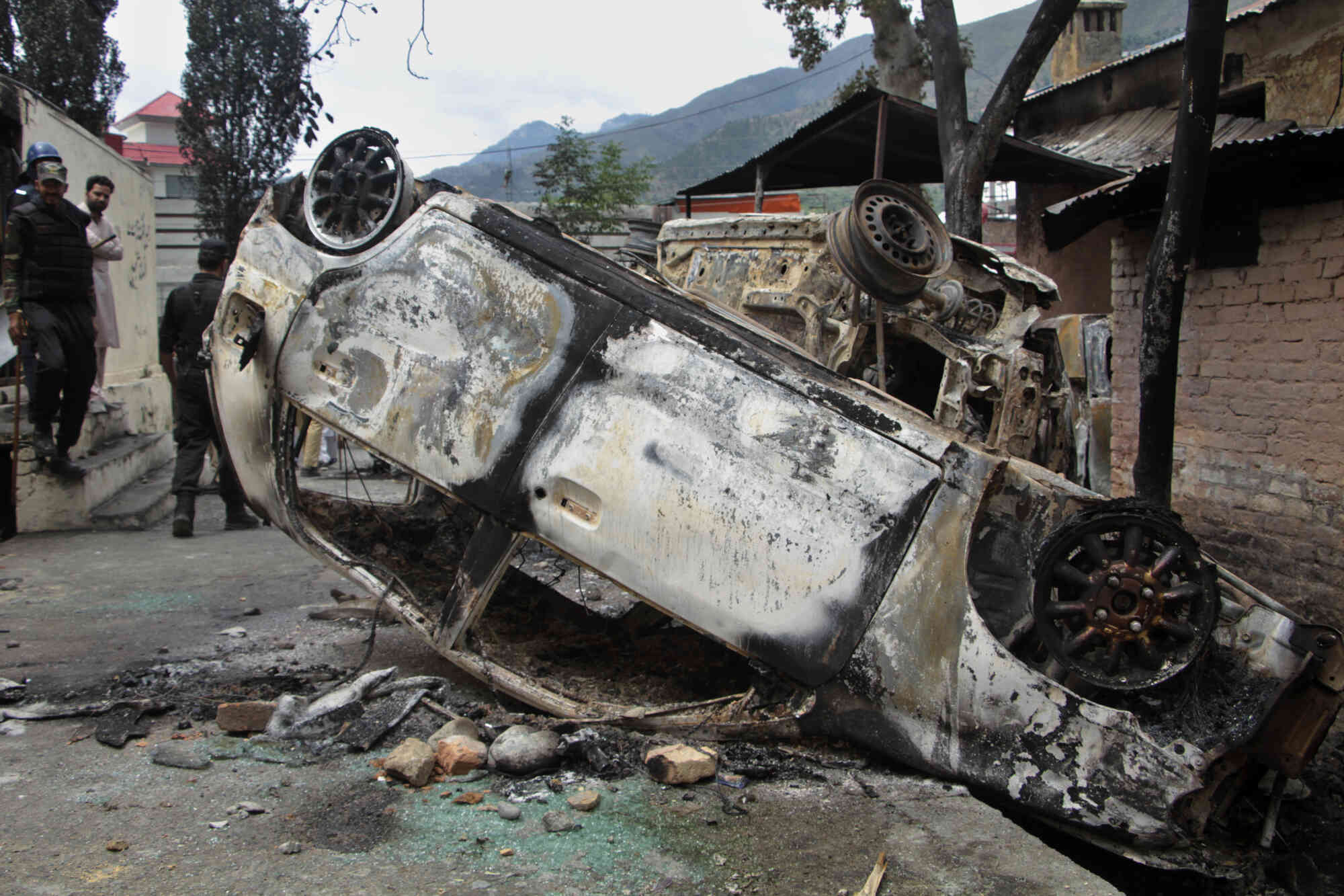Police officers examine burnt vehicles which were torched by a Muslim mob in an attack, in Madyan in Pakistan's Khyber Pakhtunkhwa province, Friday, June 21, 2024. A Muslim mob in northwestern Pakistan broke into a police station, snatched a man who was held there and then lynched him over allegations that he had desecrated Islam's holy book, the Quran. (Photo by Naveed Ali/AP Photo)