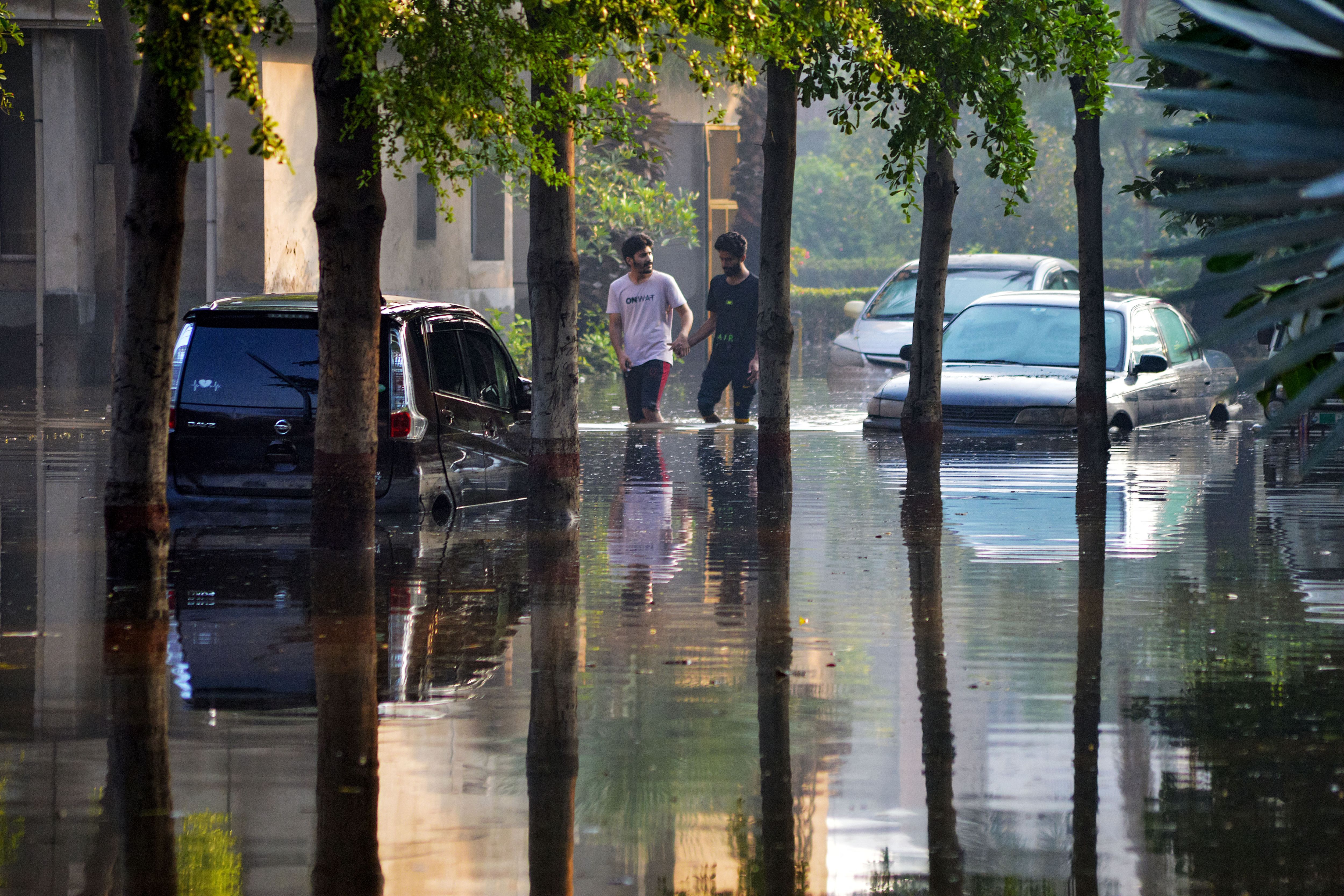 People wade through a flooded street after heavy rainfall in Faisalabad on August 5, 2024. (Photo by Ghazanfar Majid/AFP Photo)