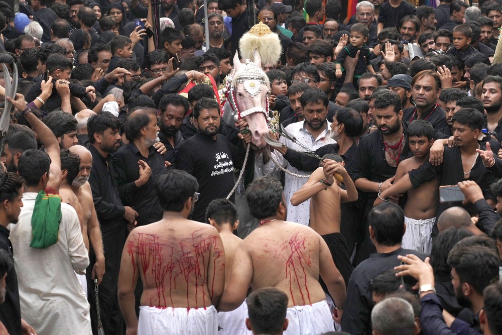 Shiite Muslims flagellate themselves with knifes attached to chains in front of a horse, that symbolizes the horse that carried Imam Hussein during the battle of Karbala, during a Muharram procession, in Lahore, Pakistan, Tuesday, July 16, 2024. Muharram, the first month of the Islamic calendar, is a month of mourning for Shiites in remembrance of the death of Hussein, the grandson of the Prophet Muhammad, at the Battle of Karbala in present-day Iraq in the 7th century. (Photo by K.M. Chaudary/AP Photo)
