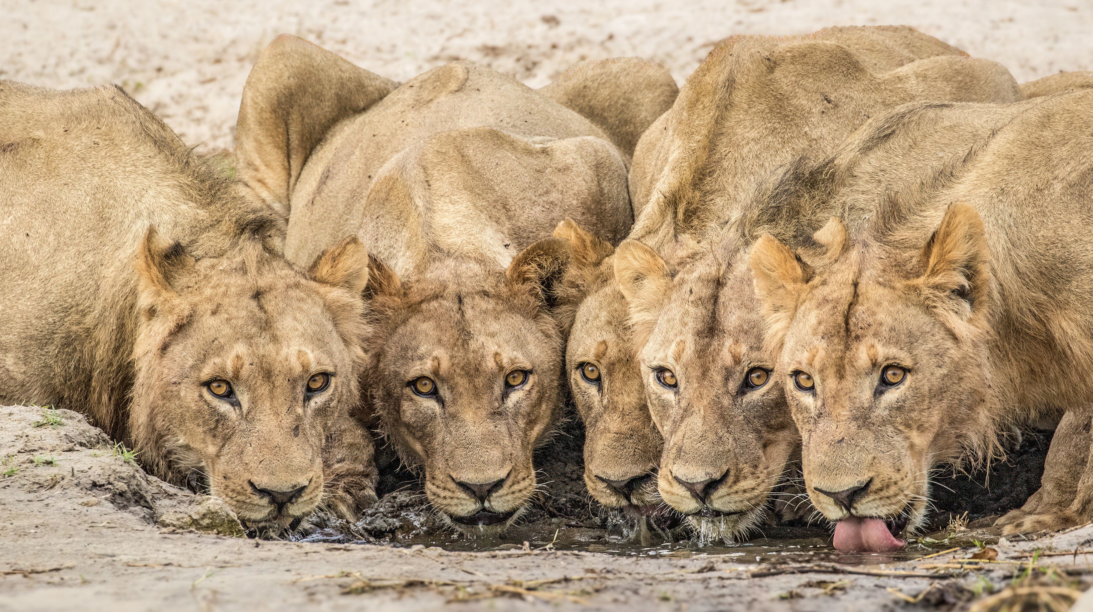 A pride of lionesses group together for safety while they drink on a bank of the Chobe river, in Chobe National Park, Botswana in March 2024. (Photo by Charl Stols/Solent News)