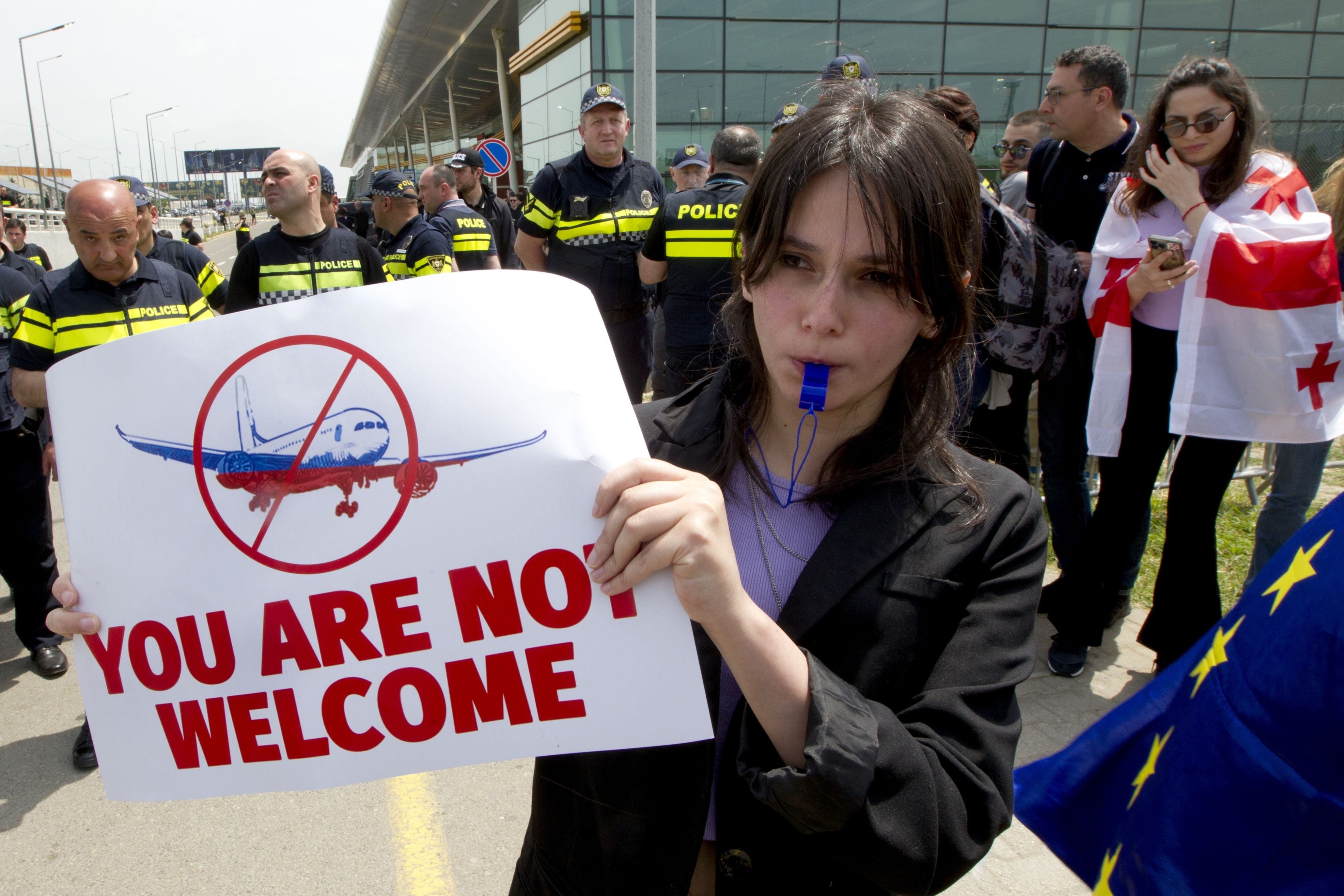 A Georgian opposition activist holds a placard during a protest against the resumption of air links with Russia, standing behind a police line at the International Airport outside Tbilisi, Georgia, Friday, May 19, 2023. Direct flights resumed on Friday between Russia and Georgia amid protests and sharp criticism from the South Caucasus nation's president, just over a week after the Kremlin unexpectedly lifted a four-year-old ban despite rocky relations. (Photo by Shakh Aivazov/AP Photo)
