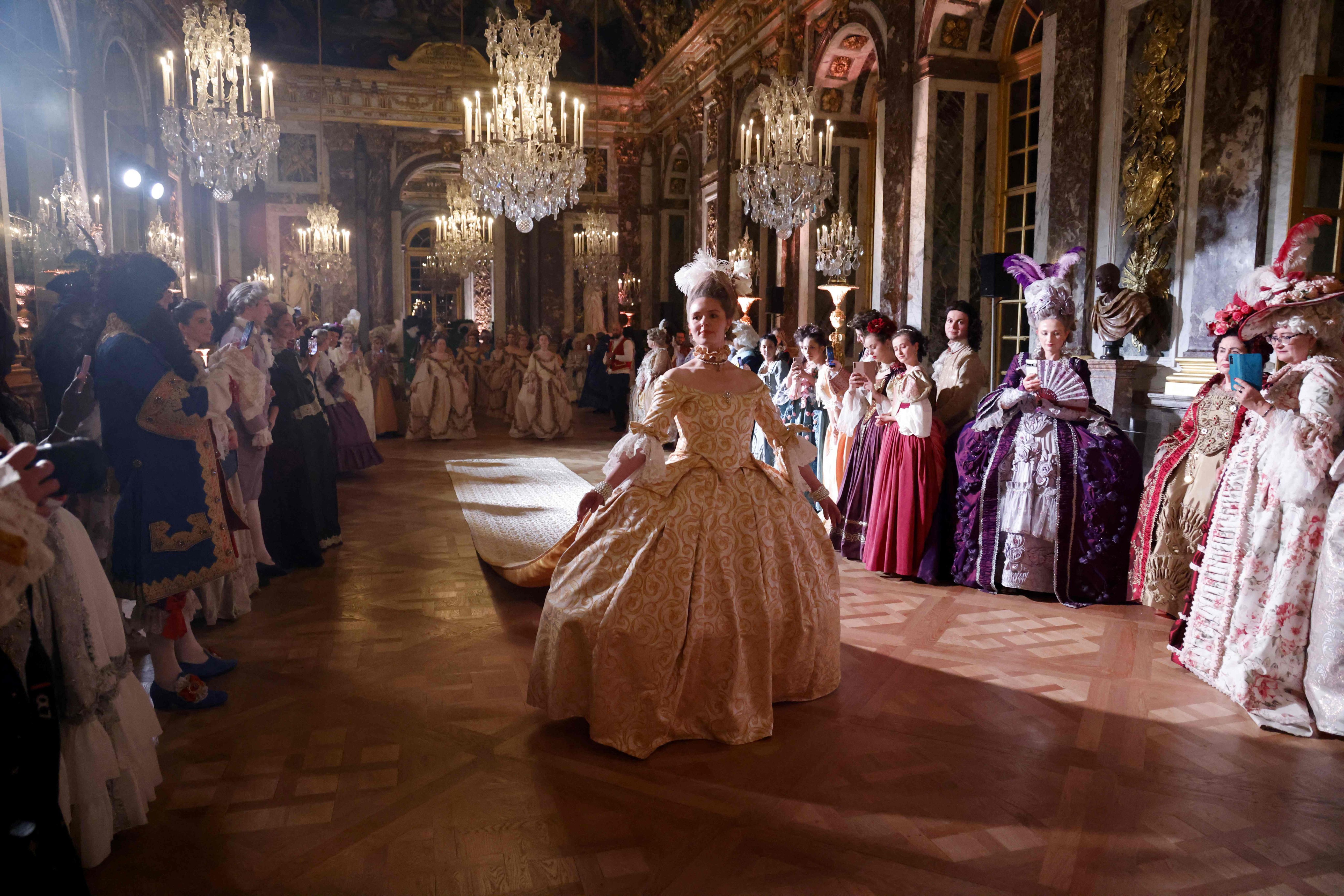 A guest wearing baroque style costume walks through the Hall of Mirrors during the “Fetes Galantes” fancy dress evening at the Chateau de Versailles, outside Paris, on May 22, 2023. The annual fancy dress ball at the Chateau de Versailles aims to re-create the baroque splendour of Louis XIV's dazzling court feasts held to show off the wealth and power of France's longest-reigning monarch at the World Heritage site, one of France's biggest tourist attractions. (Photo by Ludovic Marin/AFP Photo)