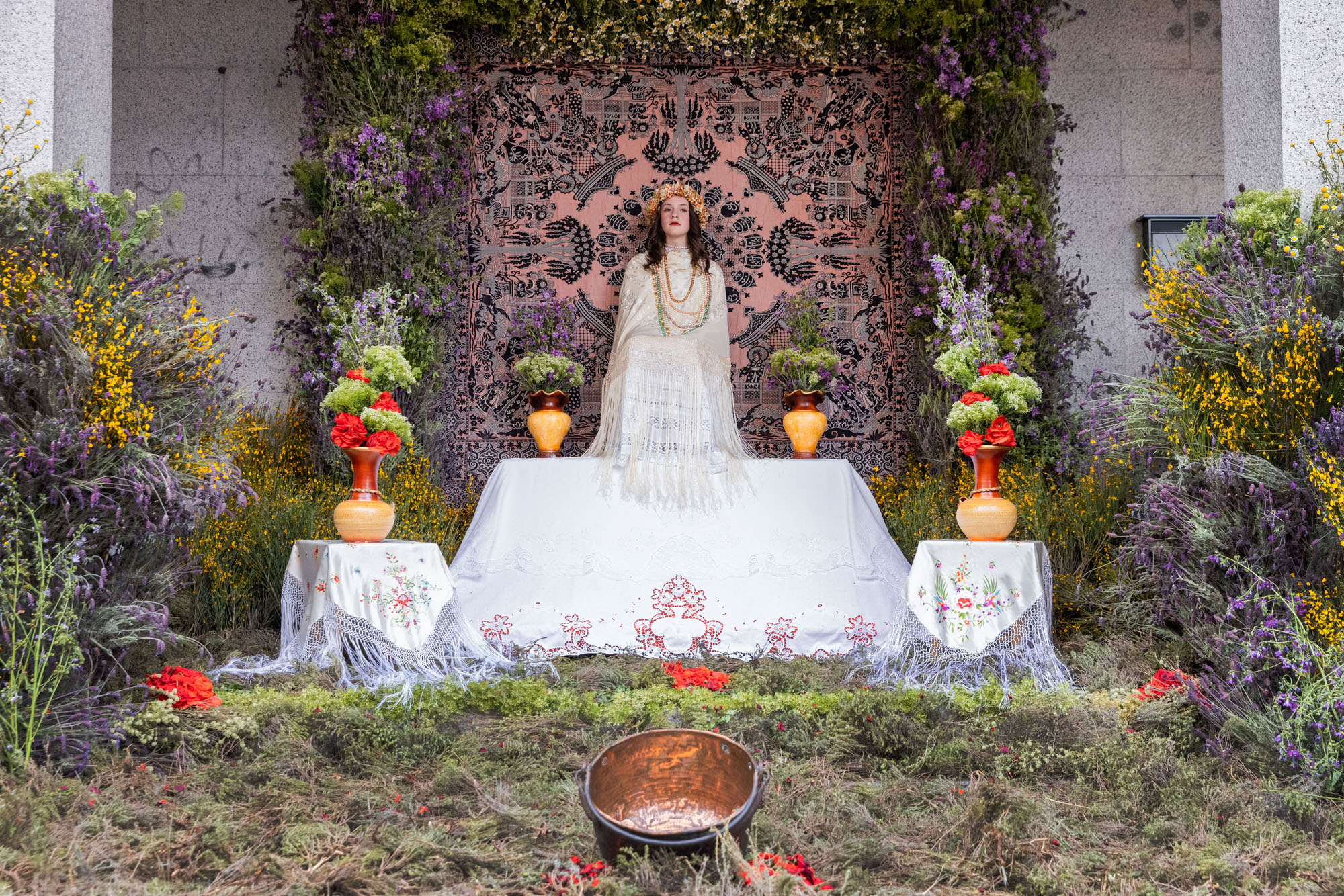 A La Maya girl sits on the altar during the celebration of La Maya festivity on May 02, 2023 in Colmenar Viejo, Spain. Las Mayas, typically girls in Colmenar Viejo, are chosen to sit at a freshly made flower altar to mark the new spring season. (Photo by Aldara Zarraoa/Getty Images)