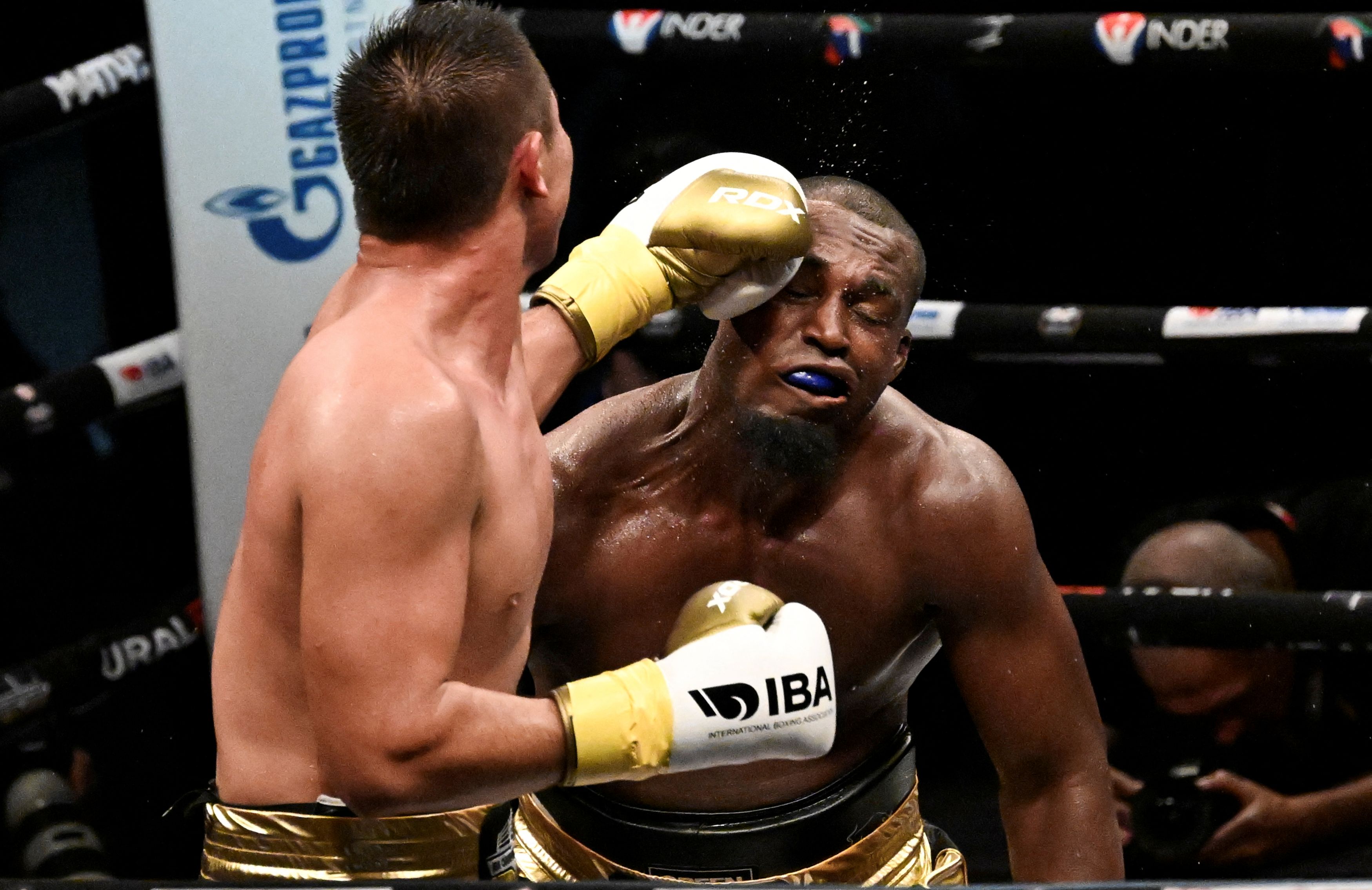 Uzbekistan's Madiyar Saydrakhimov (L) fights Cuba's Julio Cesar La Cruz during the 92 kg boxing match of the Night of Champions by the International Boxing Association (IBA) in Habana on August 27, 2024. Two-time Olympic champion Julio César La Cruz closed on Tuesday with a flourish for Cuban boxing at the six-fight IBA lineup held in Havana, which marked the return of professional boxing to the island after more than five decades of absence. (Photo by Yamil Lage/AFP Photo)