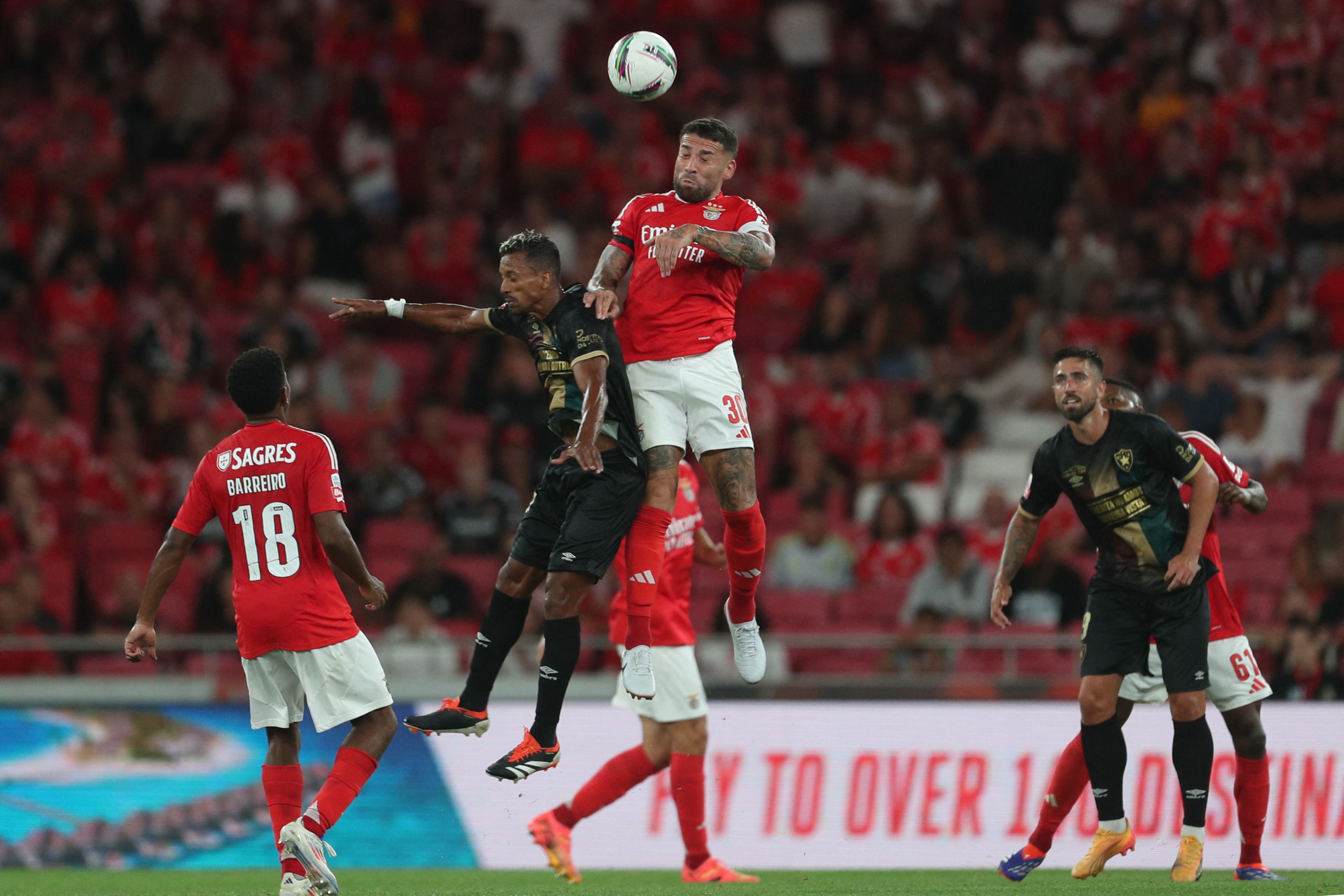 Estrela da Amadora's Portuguese forward #25 Nilton Varela Lopes (2L) and Benfica's Argentine defender #30 Nicolas Otamendi vie for a header during the Portuguese League football match between SL Benfica and CF Estrela da Amadora at the Luz stadium in Lisbon, on August 24, 2024. (Photo by Carlos Costa/AFP Photo)