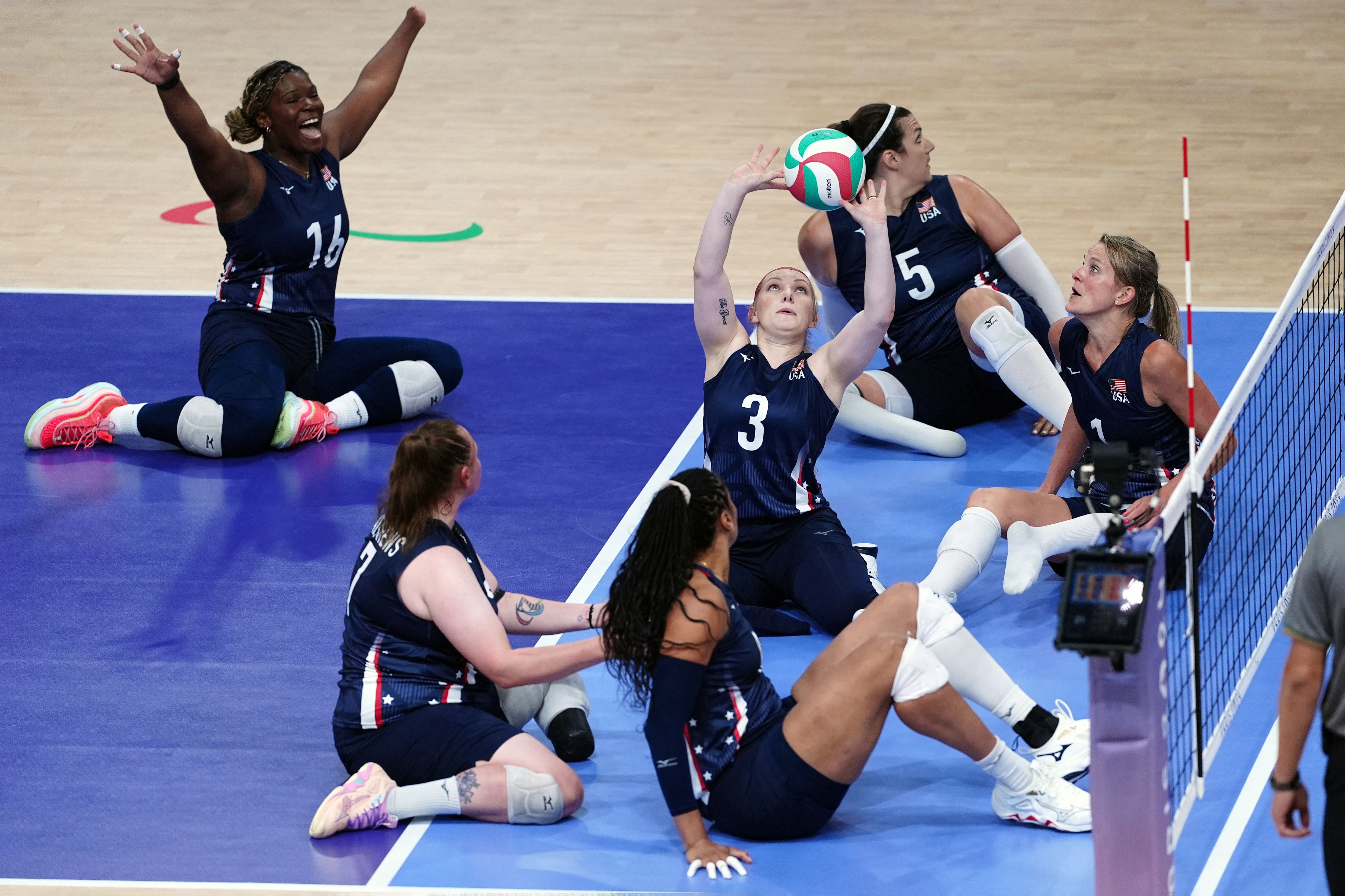 US #3 Alexis Ann Shifflett-Patterson (C) competes in a sitting volleyball women's preliminary round pool A match between USA and China during the Paris 2024 Paralympic Games at the North Paris Arena in Paris on August 30, 2024. (Photo by Dimitar Dilkoff/AFP Photo)