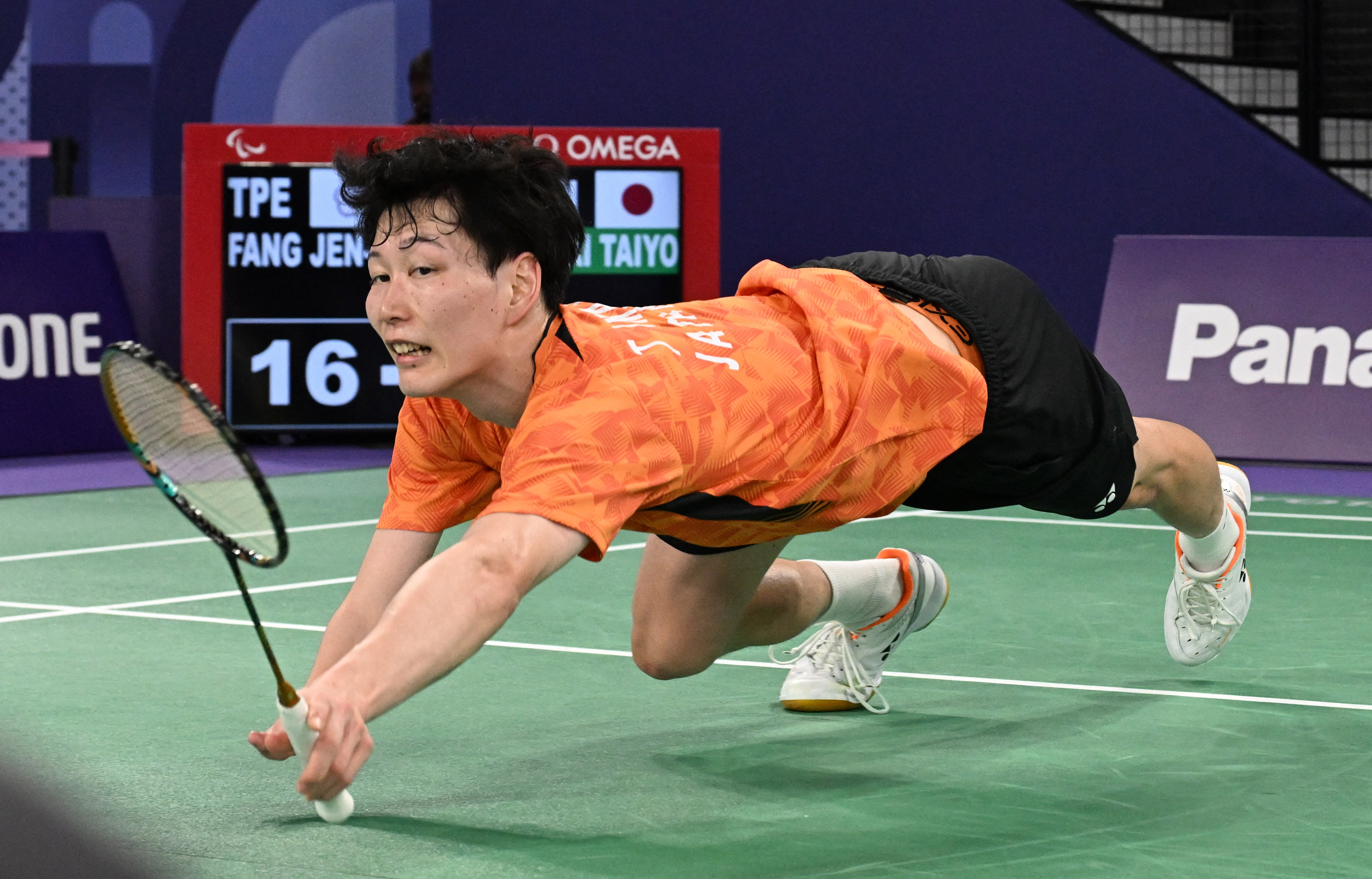 Imai Taiyo of Japan plays a shot against Jen-Yu Fang of Chinese Taipei (not pictured) during the Men's Singles SU5 Group Play Stage – Group B match on day two of the Paris 2024 Summer Paralympic Games at Porte de La Chapelle Arena on August 30, 2024 in Paris, France. (Photo by Jennifer Lorenzini/Reuters)