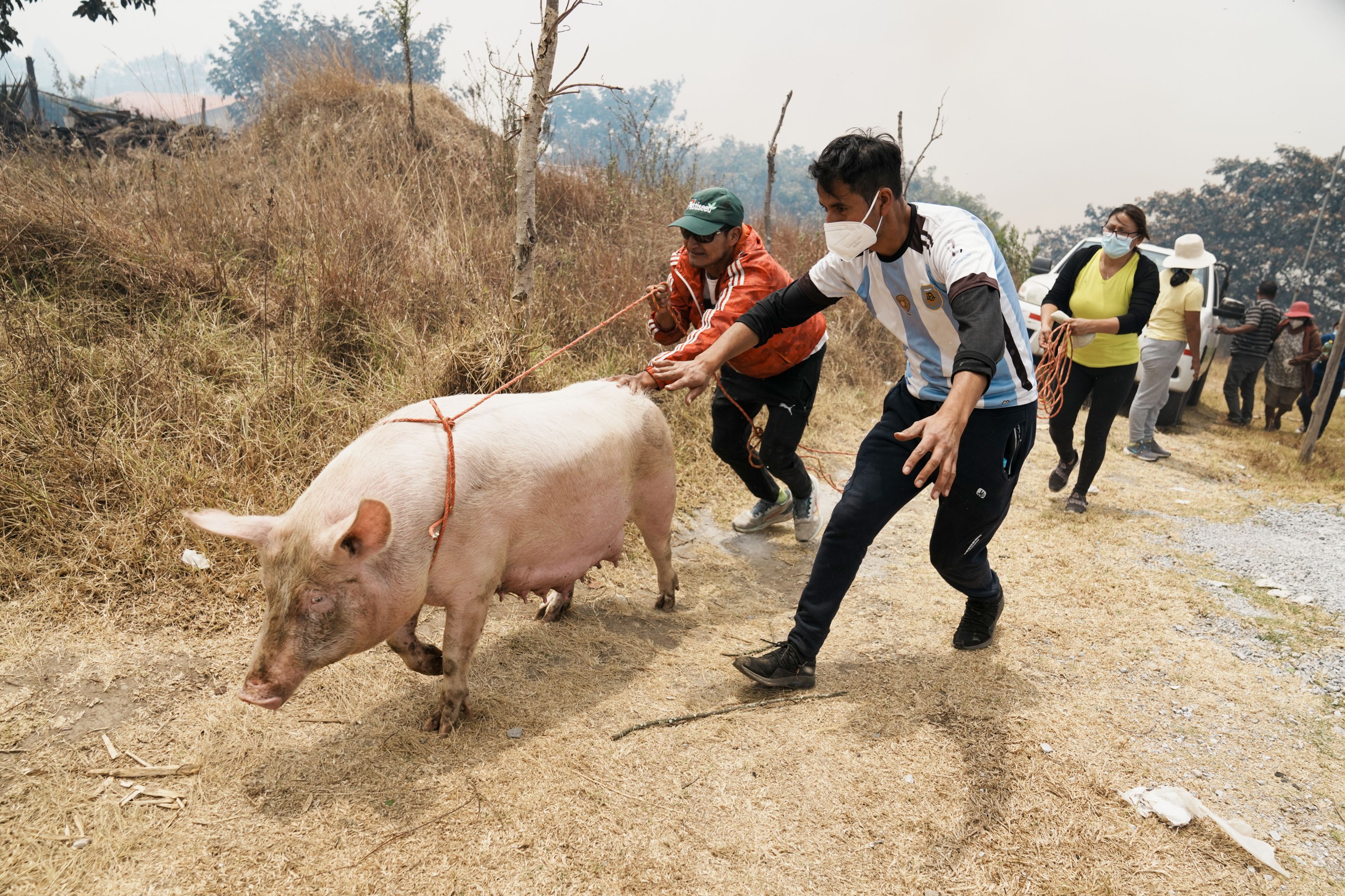 Residents herd a pig as they flee an encroaching forest fire threatening their homes in the Nayon neighborhood of Quito, Ecuador, Thursday, September 5, 2024. (Photo by Dolores Ochoa/AP Photo)