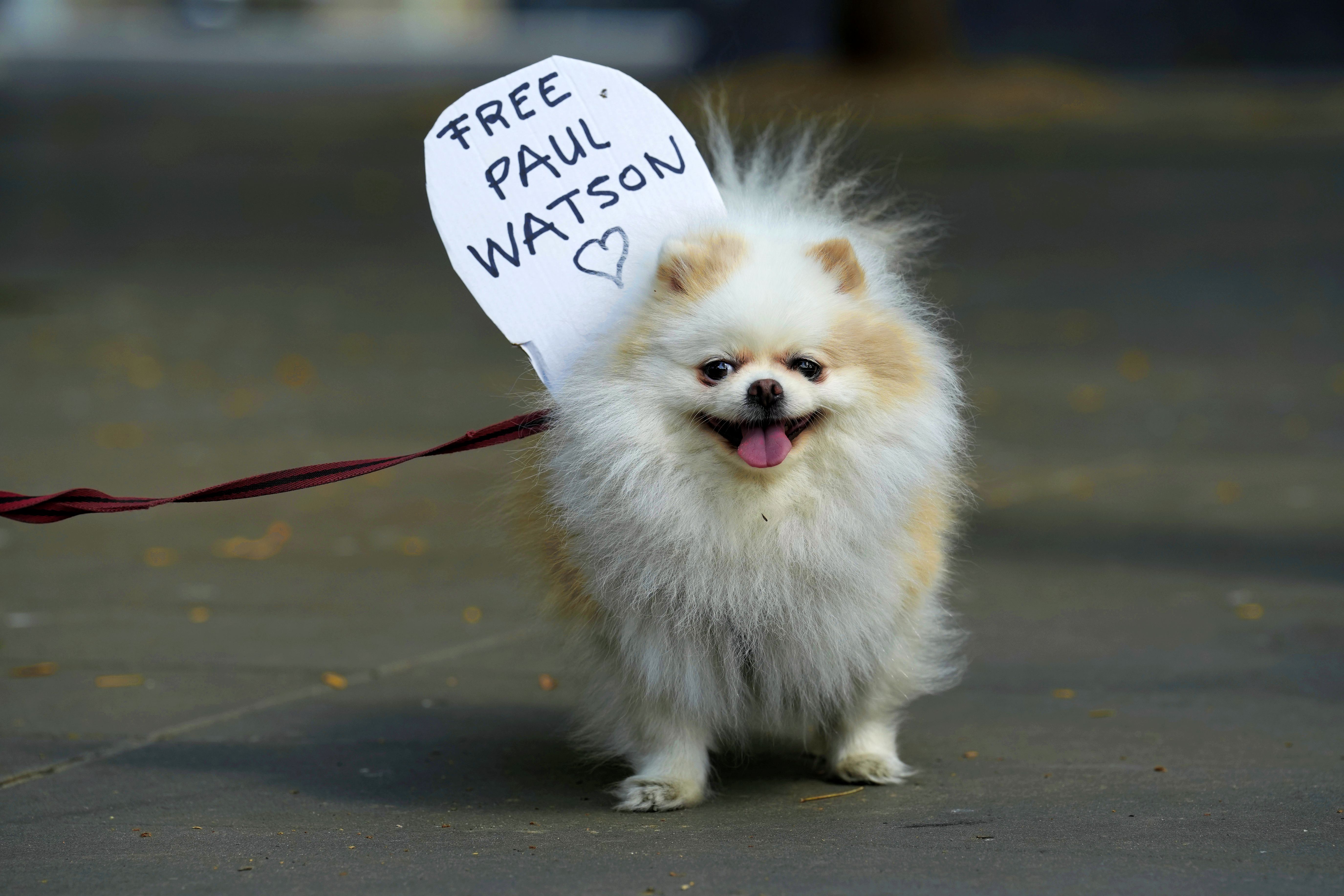 A placard is placed on a dog during a gathering to demand the release of activist Paul Watson from Greenland prison, in Paris, France, Wednesday, September 4, 2024. Watson, founder and President of the animal rights and environmental Sea Shepherd Conservation, was arrested by Greenland police, July 21, 2024, on an international arrest warrant issued by Japan. (Photo by Aurelien Morissard/AP Photo)