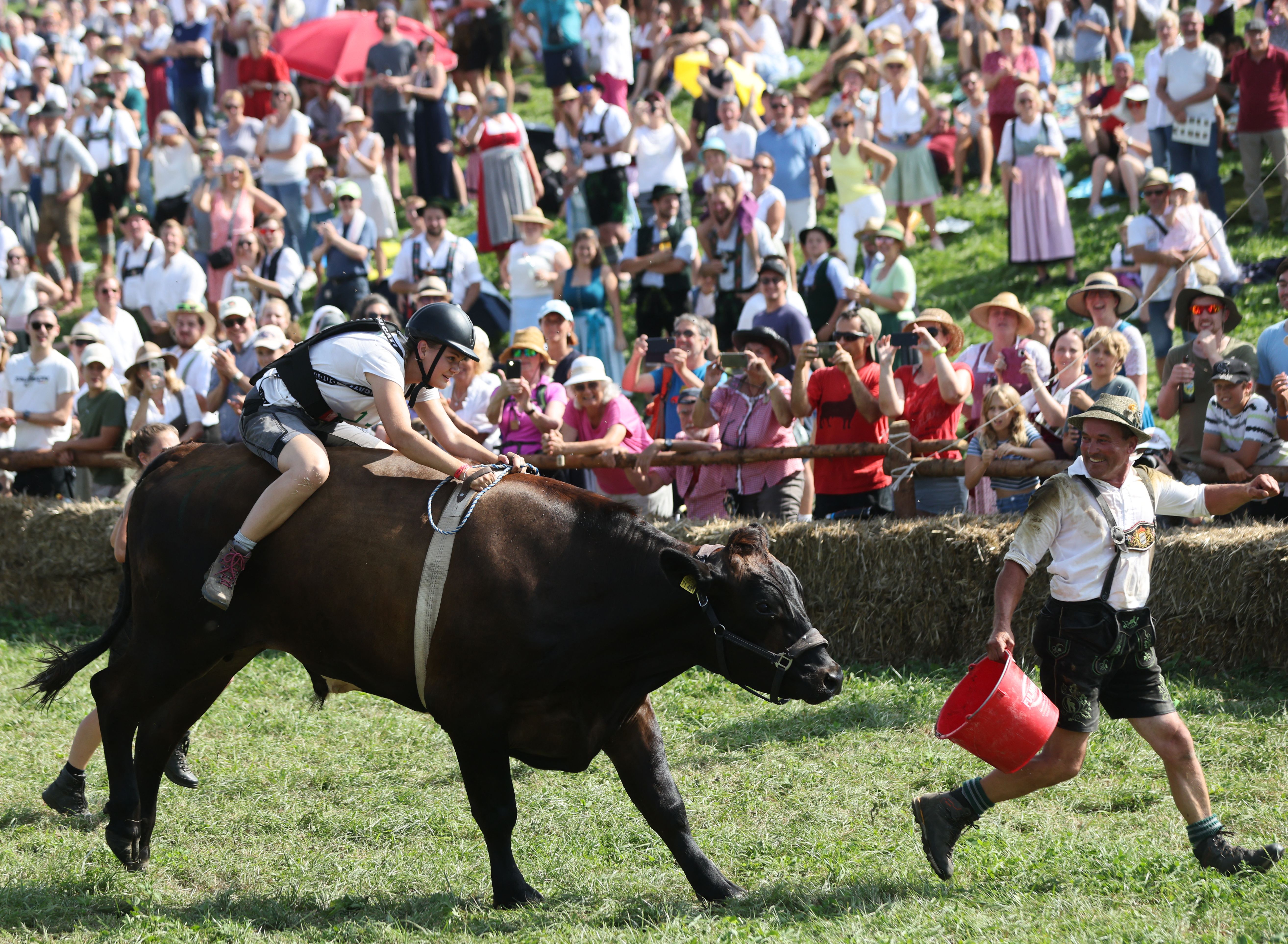A participant competes in the traditional ox race in Muensing, southern Germany on September 1, 2024. (Photo by Alexandra Beier/AFP Photo)