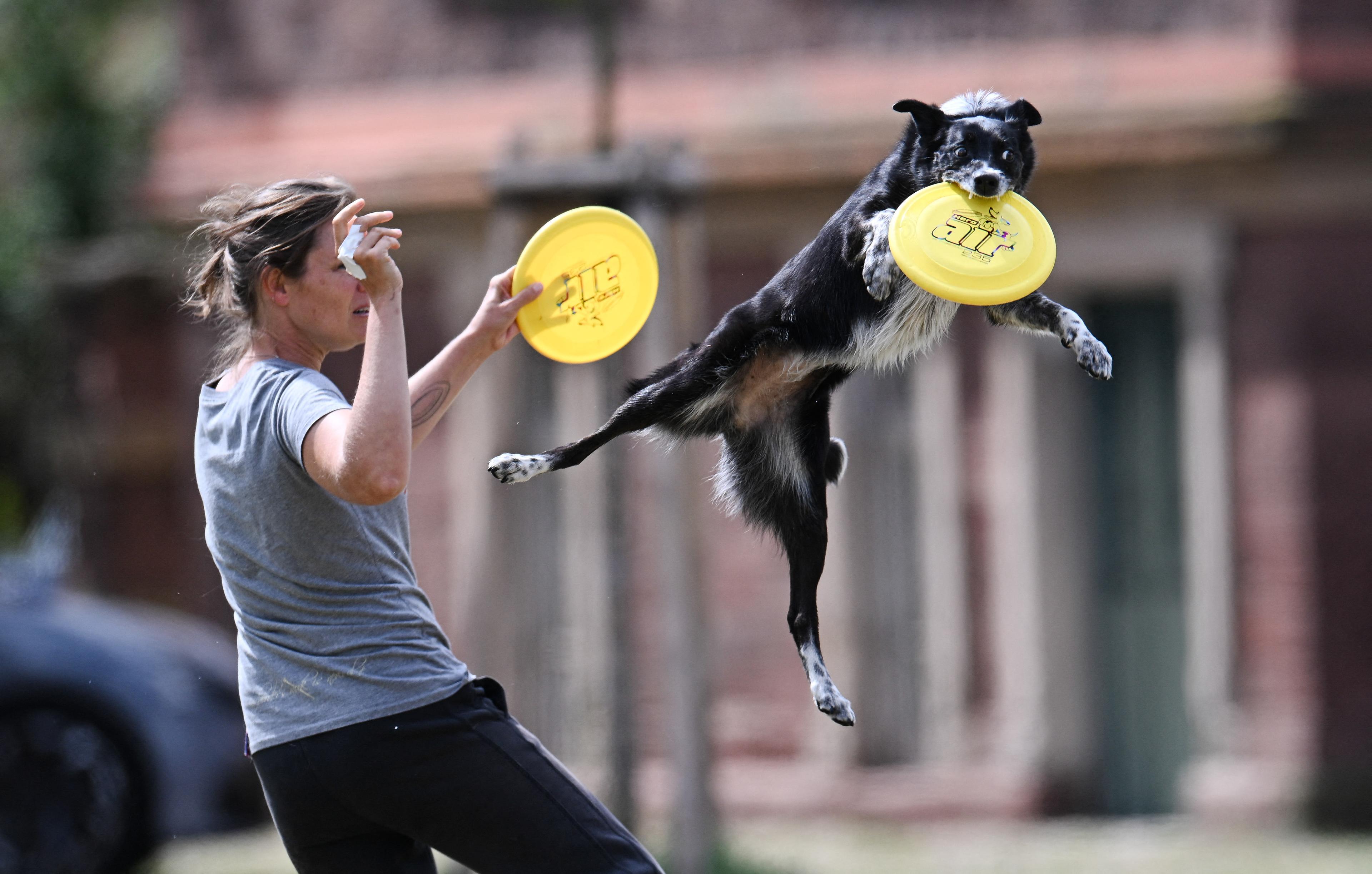 A woman trains her dog to catch a frisbee In Karlsruhe, southern Germany, on August 25, 2024. (Photo by Thomas Kienzle/AFP Photo)