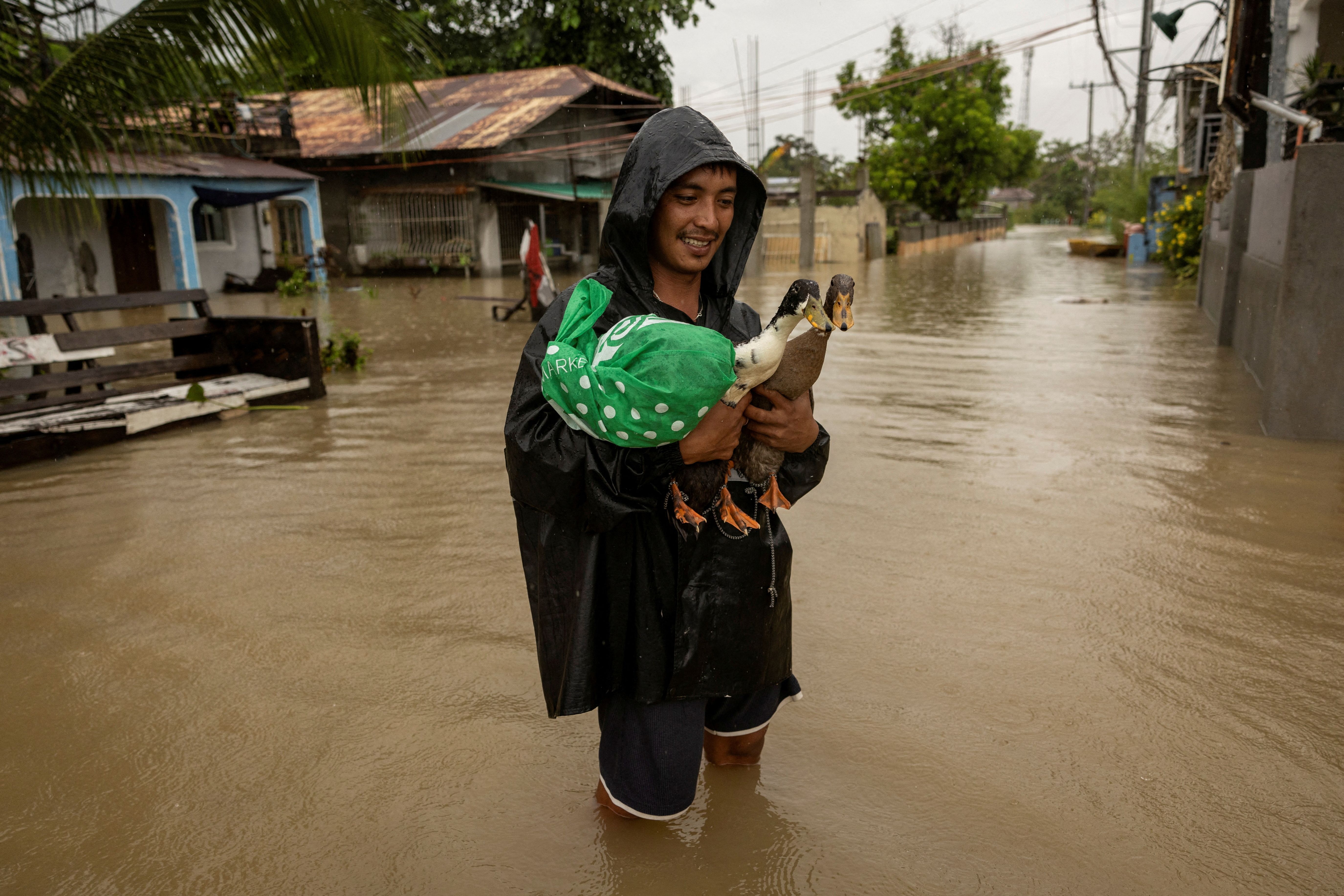 Jasper Miranda, 26, wades through floodwaters with his pet ducks that he saved from their flooded house during Tropical Storm Yagi, locally known as Enteng in Apalit, Pampanga, Philippines on September 5, 2024. (Photo by Eloisa Lopez/Reuters)