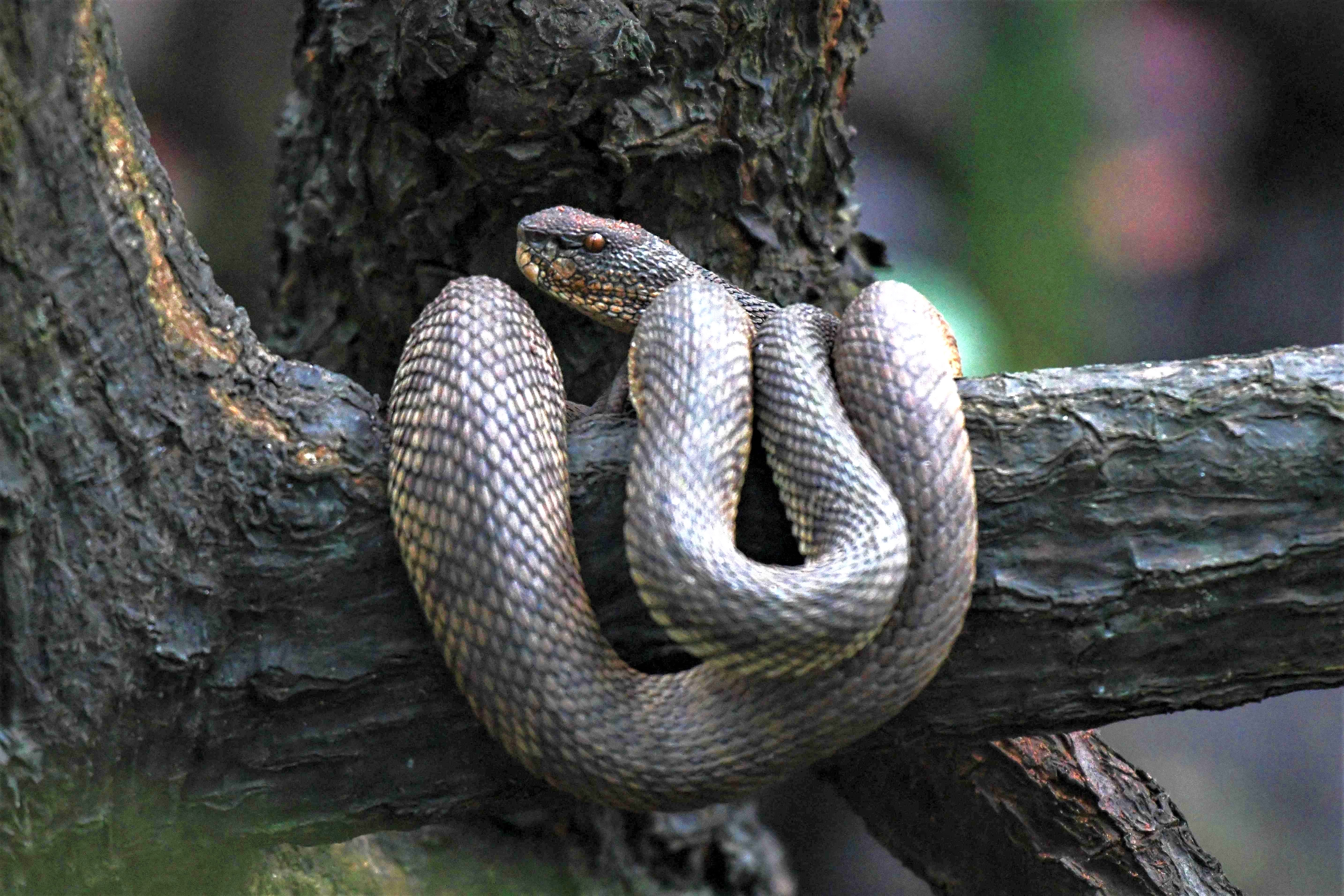 A pit viper sits on a tree branch in a swamp at Pasir Ris park in Singapore on January 19, 2023. (Photo by Roslan Rahman/AFP Photo)
