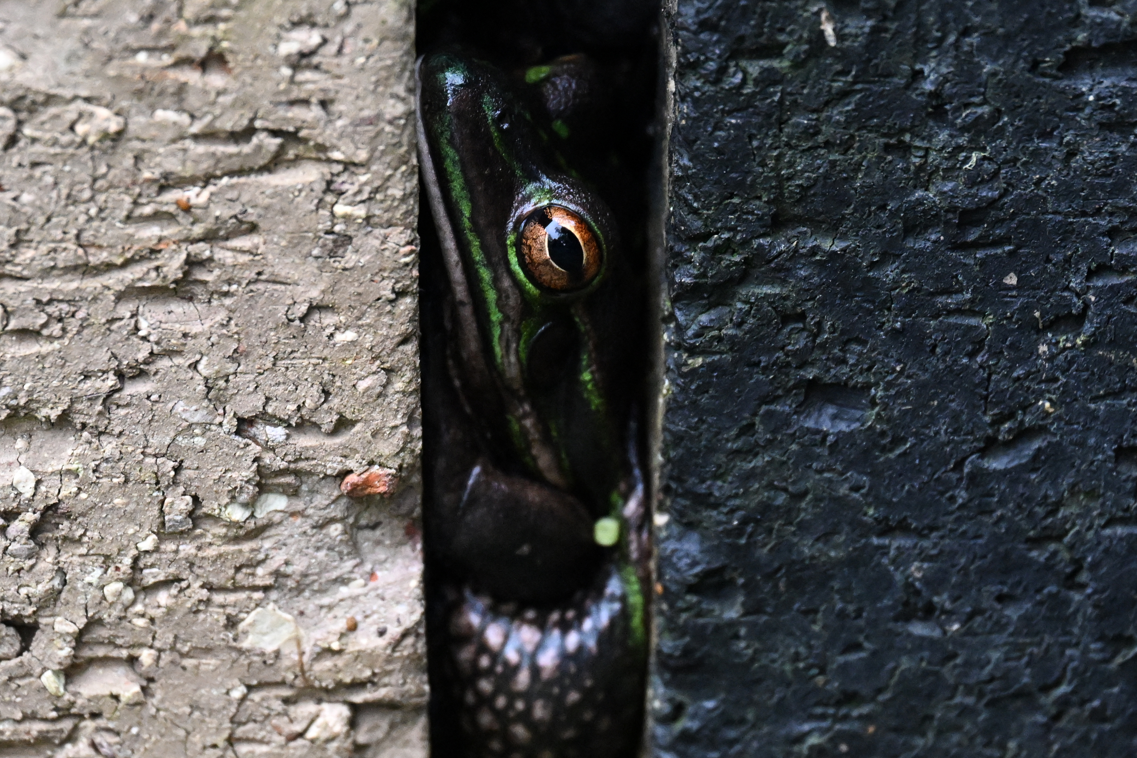 This picture taken on August 13, 2024 shows a green and golden frog, an endangered specie, hiding between bricks inside a sauna at the research center of Macquarie University in Sydney. Hundreds of endangered Green and Golden Bell frogs huddle inside a sauna, protected from Sydney's winter chill. The sauna – a small greenhouse containing black-painted bricks – may offer a pleasant warmth, but it is also protecting the frogs from the deadly chytrid fungus that would otherwise drive them to extinction. (Photo by Saeed Khan/AFP Photo)
