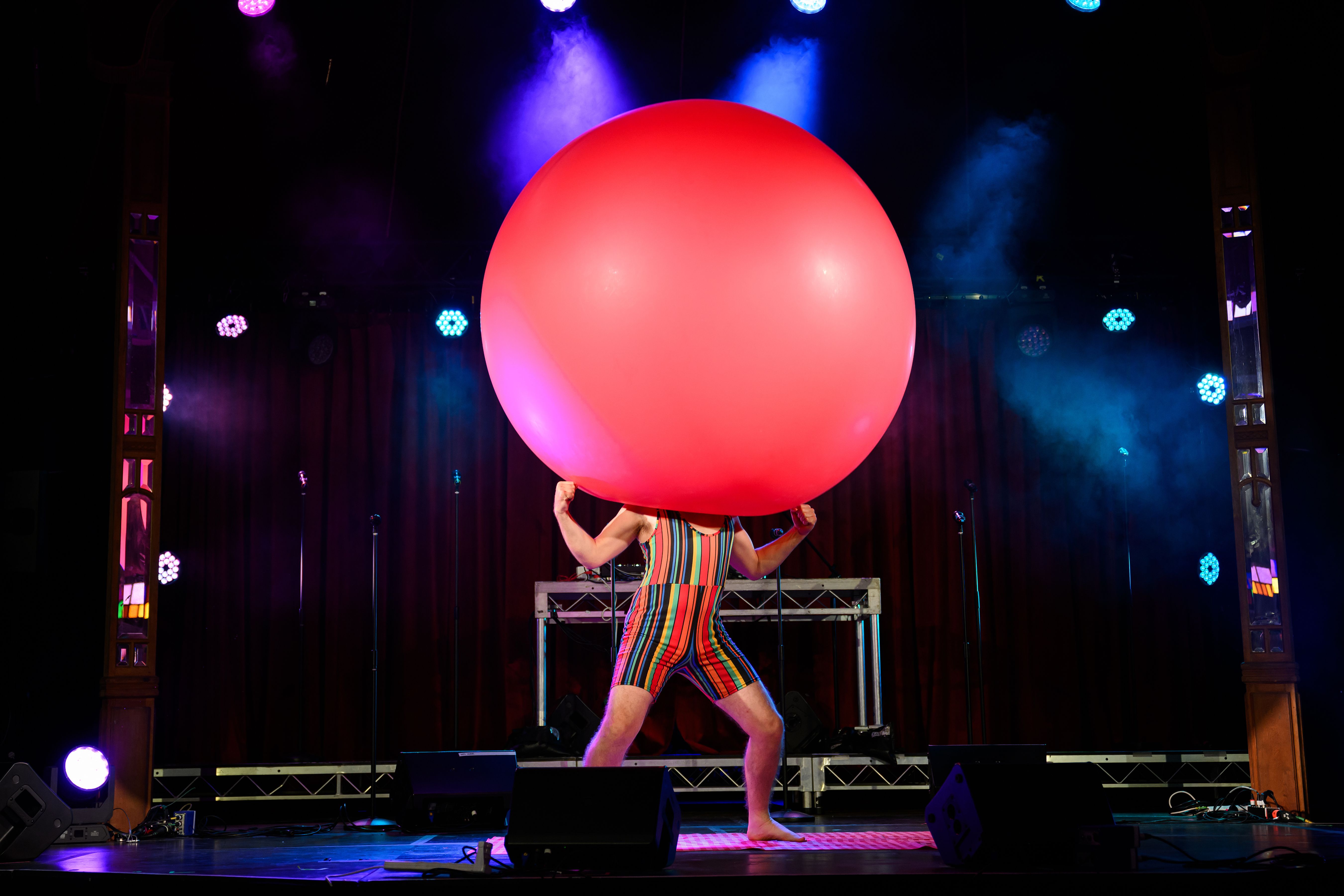 Dizzy O’Dare performs his giant balloon show during the launch of the Sydney fringe festival at Spiegeltent Festival Garden in Sydney, Australia on September 2, 2024. (Photo by Bianca de Marchi/AAP)