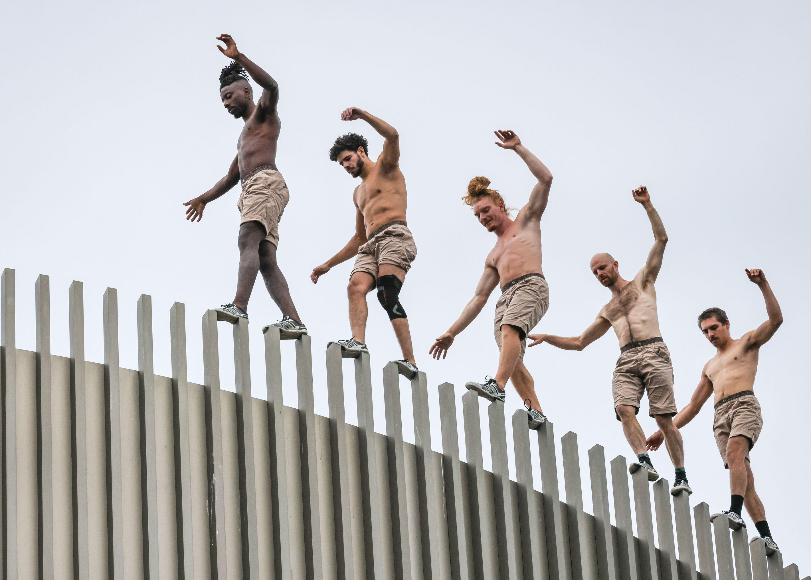 Artists from Lézards Bleus perform parkour during the Greenwich+Docklands international festival in London, England on August 31, 2024. (Photo by Imageplotter/Alamy Live News)