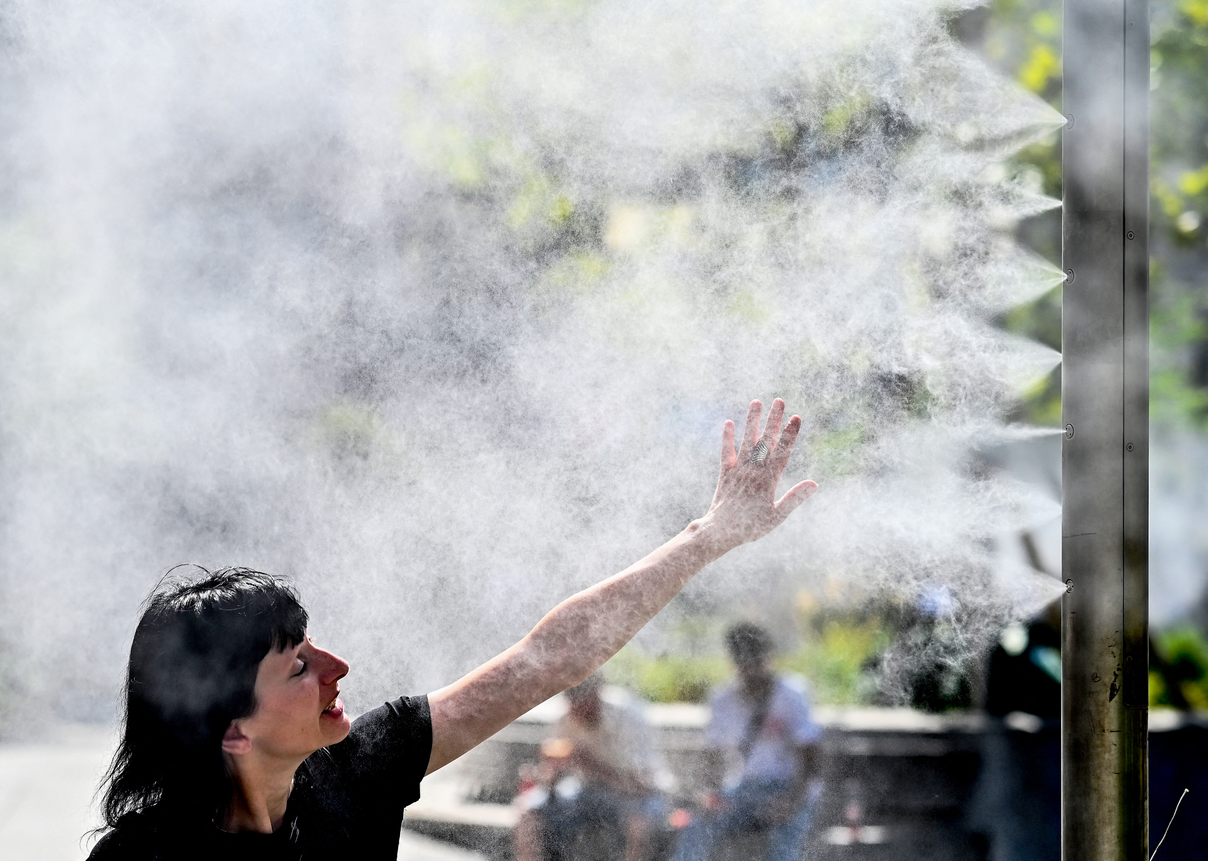A woman cools down by a water sprayer in Vienna, Austria on a warm September 3, 2024. (Photo by Joe Klamar/AFP Photo)