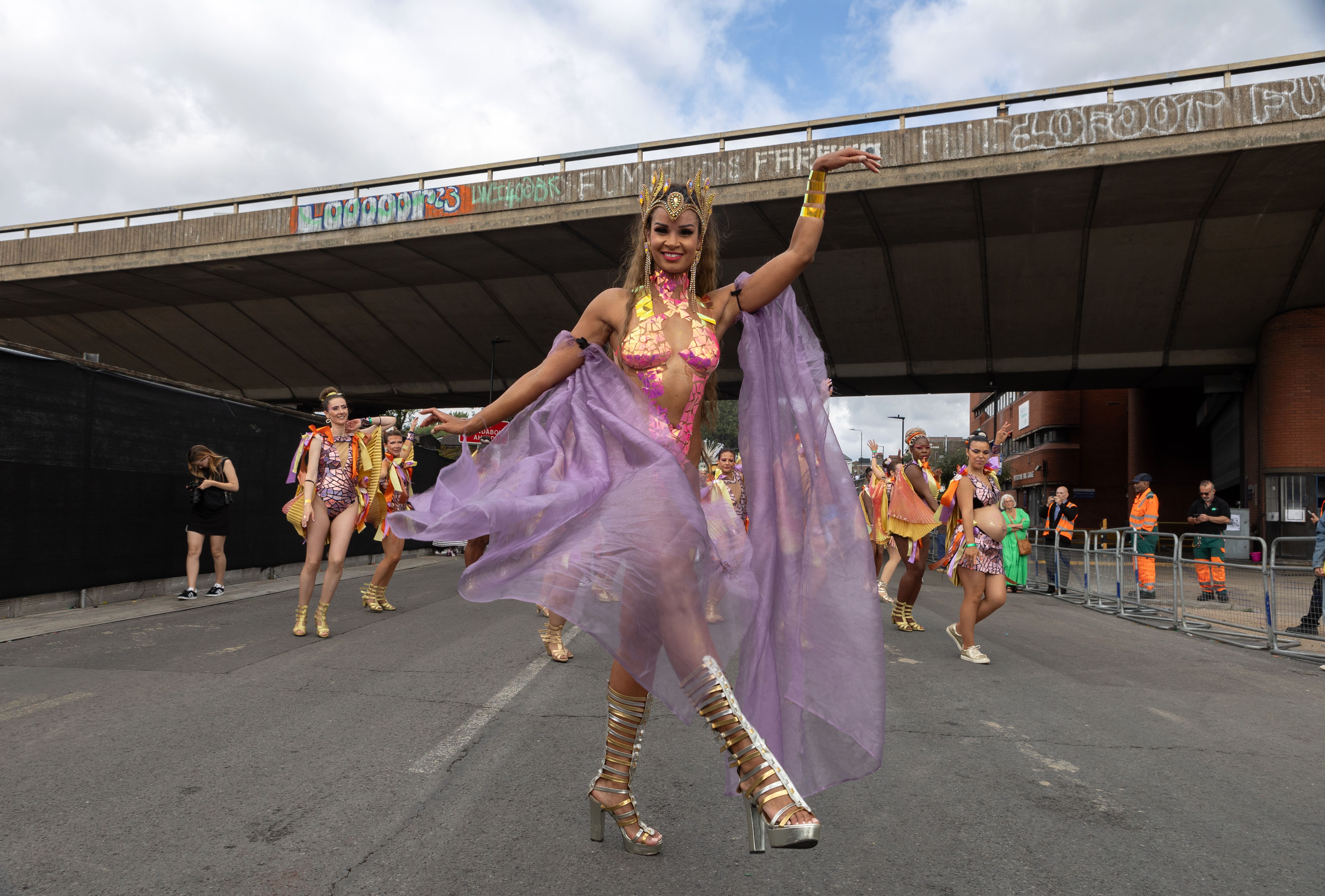Patsy Hayward of the London School of Samba dances her way into the Notting Hill carnival in West London in the last decade of August 2016. (Photo by Andy Hall/The Observer)