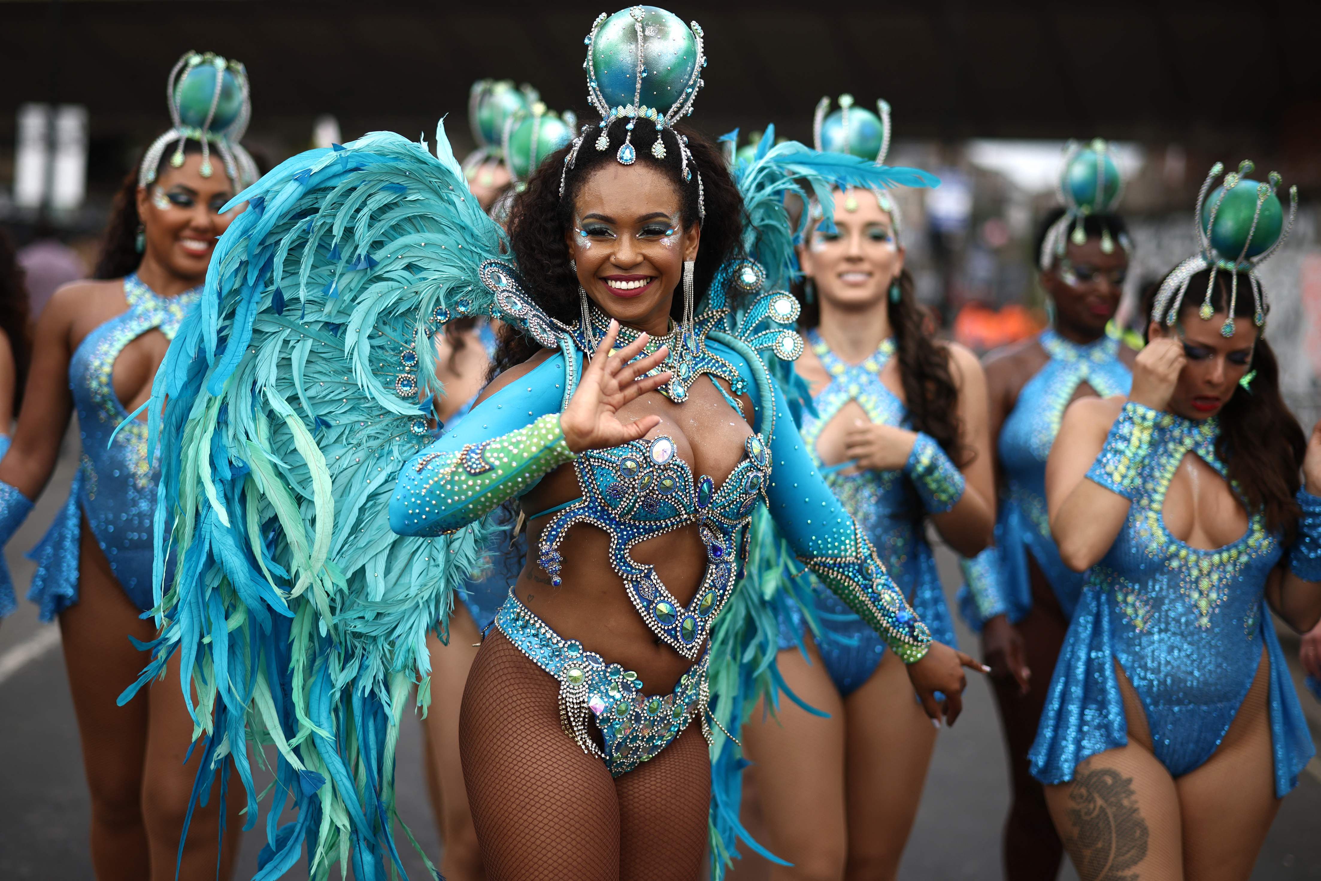 Performers in costume take part in the main parade of the Notting Hill Carnival in west London on August 27, 2023. (Photo by Henry Nicholls/AFP Photo)