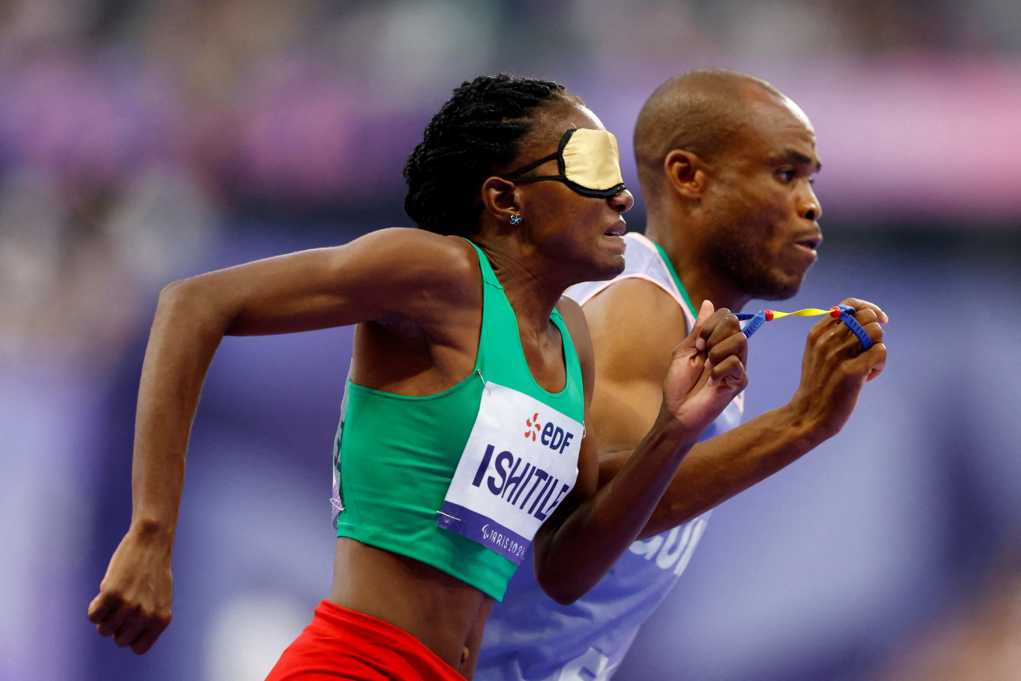 Lahja Ishitile of Namibia with guide Sem Shimanda in action during the women's 400m T11 final in Saint-Denis, France on August 31, 2024. (Photo by Stephanie Lecocq/Reuters)