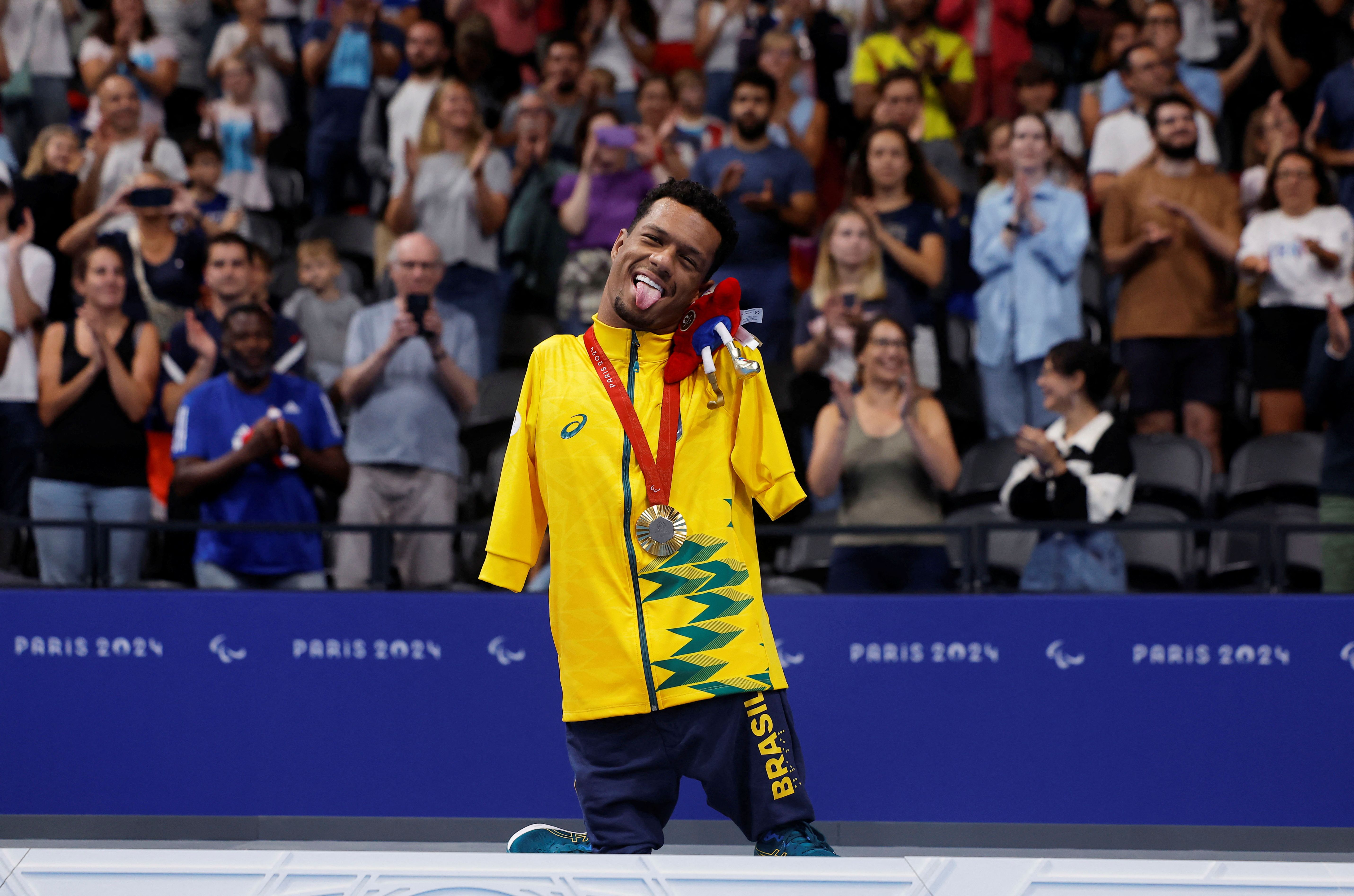Gold medallist Gabriel Geraldo dos Santos Araujo Gabriel Geraldo of Brazil celebrates on the podium with his medal after the men's 50m backstroke S2 final in Nanterre, France on August 31, 2024. (Photo by Andrew Couldridge/Reuters)