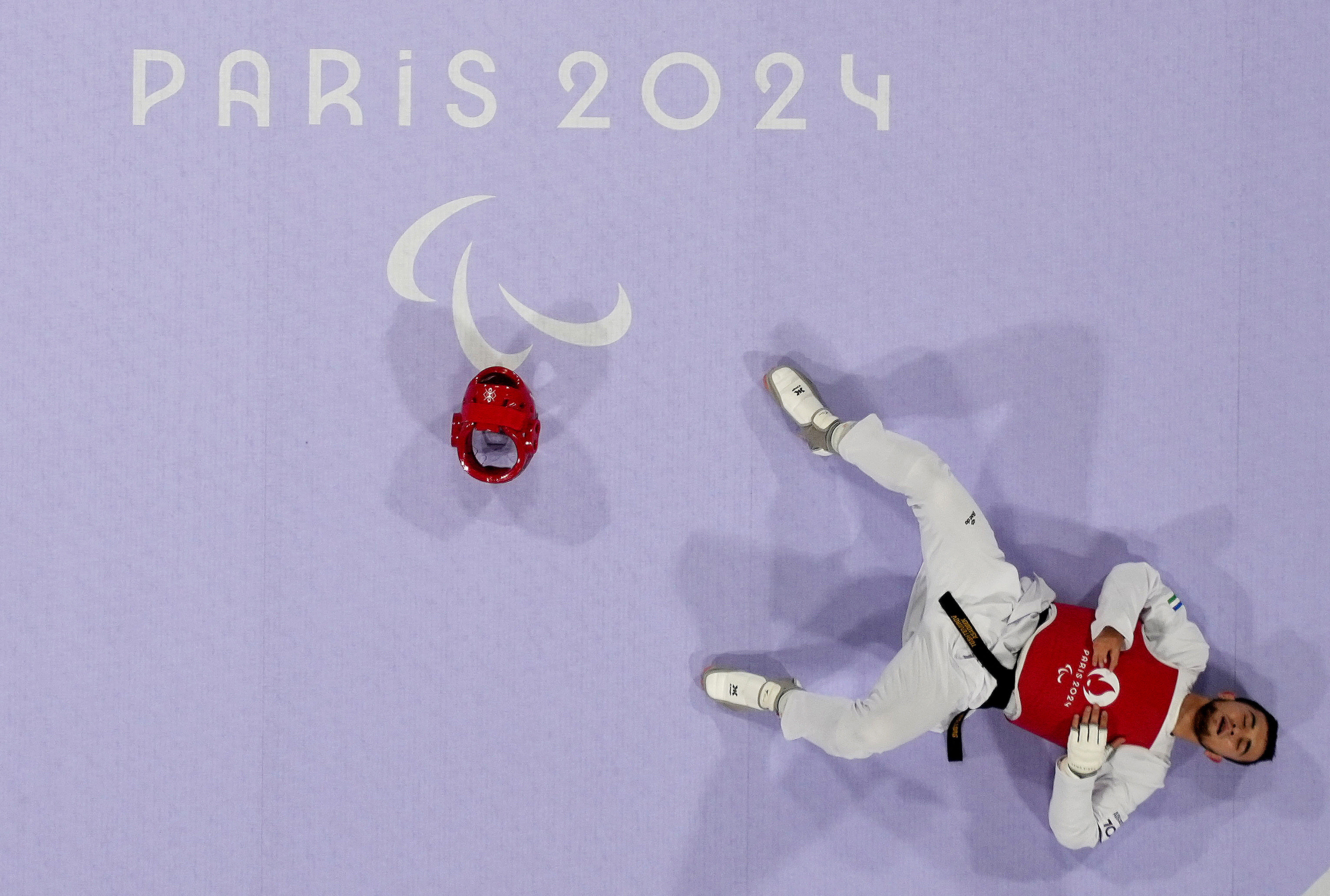 Asadbek Toshtemirov of Uzbekistan reacts during his fight against Alireza Bakht of Iran in the men's K44 80kg taekwondo semifinal in Paris, France on August 31, 2024. (Photo by Maja Smiejkowska/Reuters)