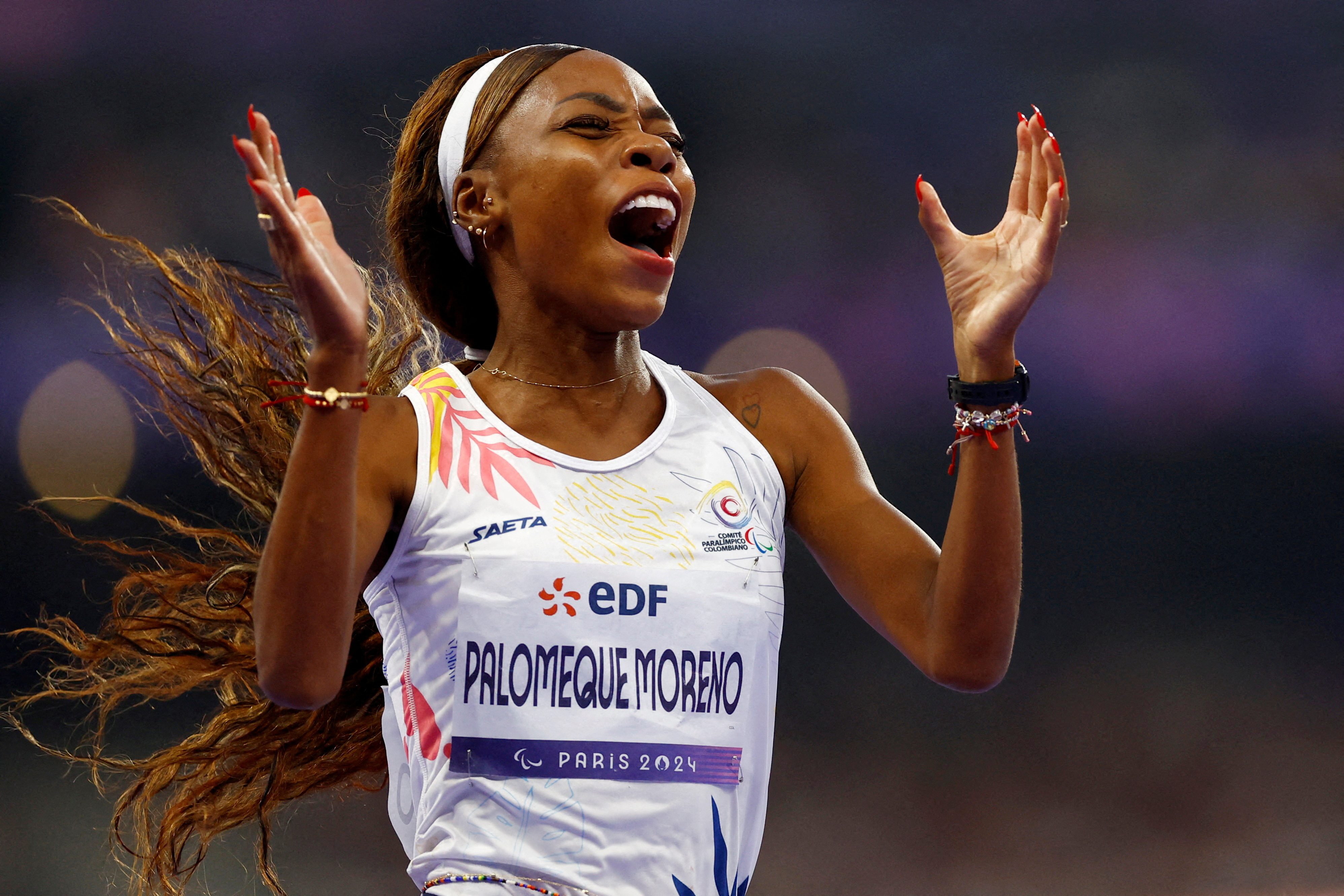 Karen Tatiana Palomeque Moreno of Team Colombia celebrates winning the Para Athletics Women's 100m - T38 Final on day three of the Paris 2024 Summer Paralympic Games at Stade de France on August 31, 2024 in Paris, France. (Photo by Stephanie Lecocq/Reuters)