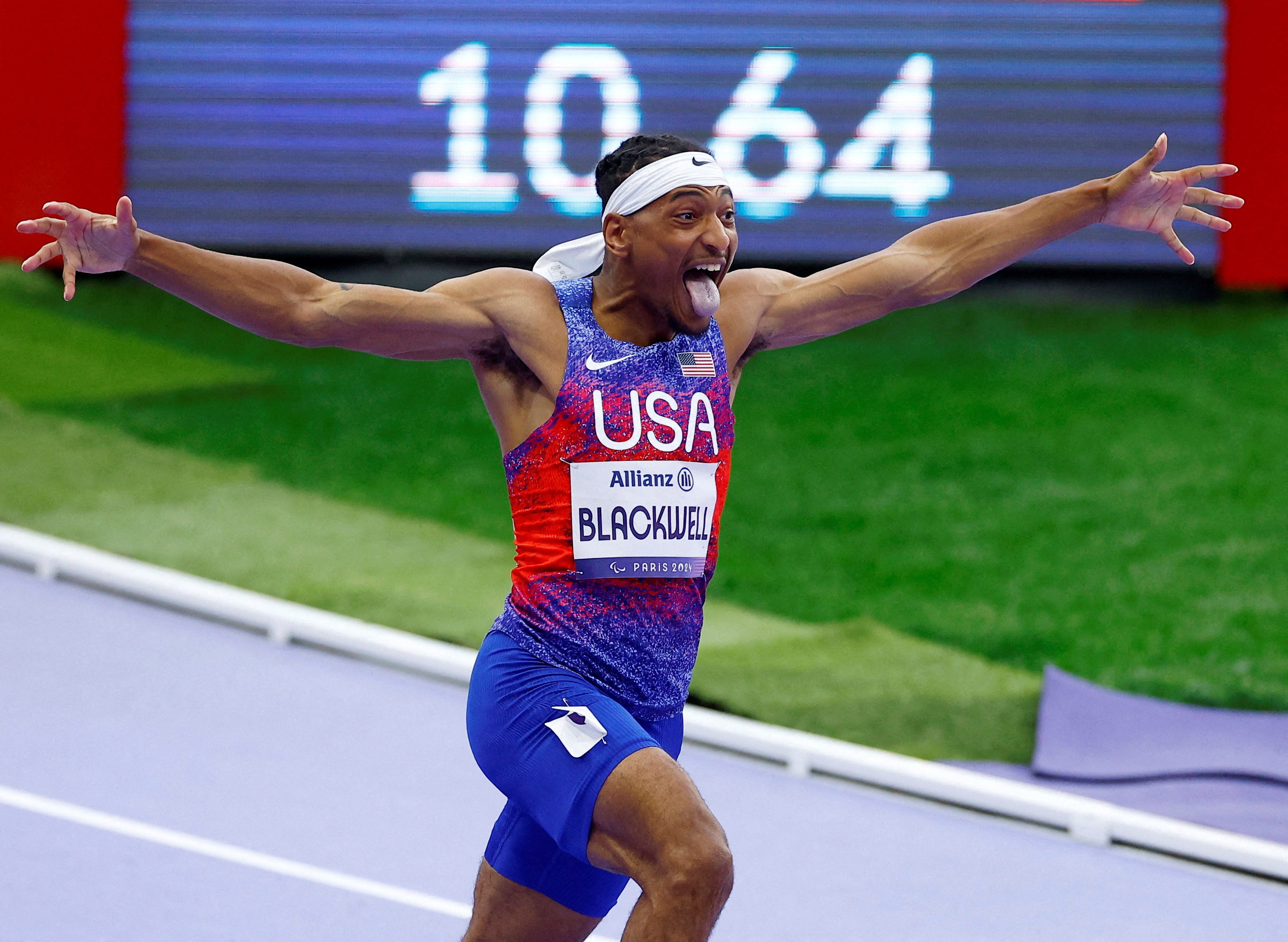 Jaydin Blackwell of United States celebrates after setting a new world record to win gold in the men's 100m T38 in Saint-Denis, France on August 31, 2024. (Photo by Christian Hartmann/Reuters)