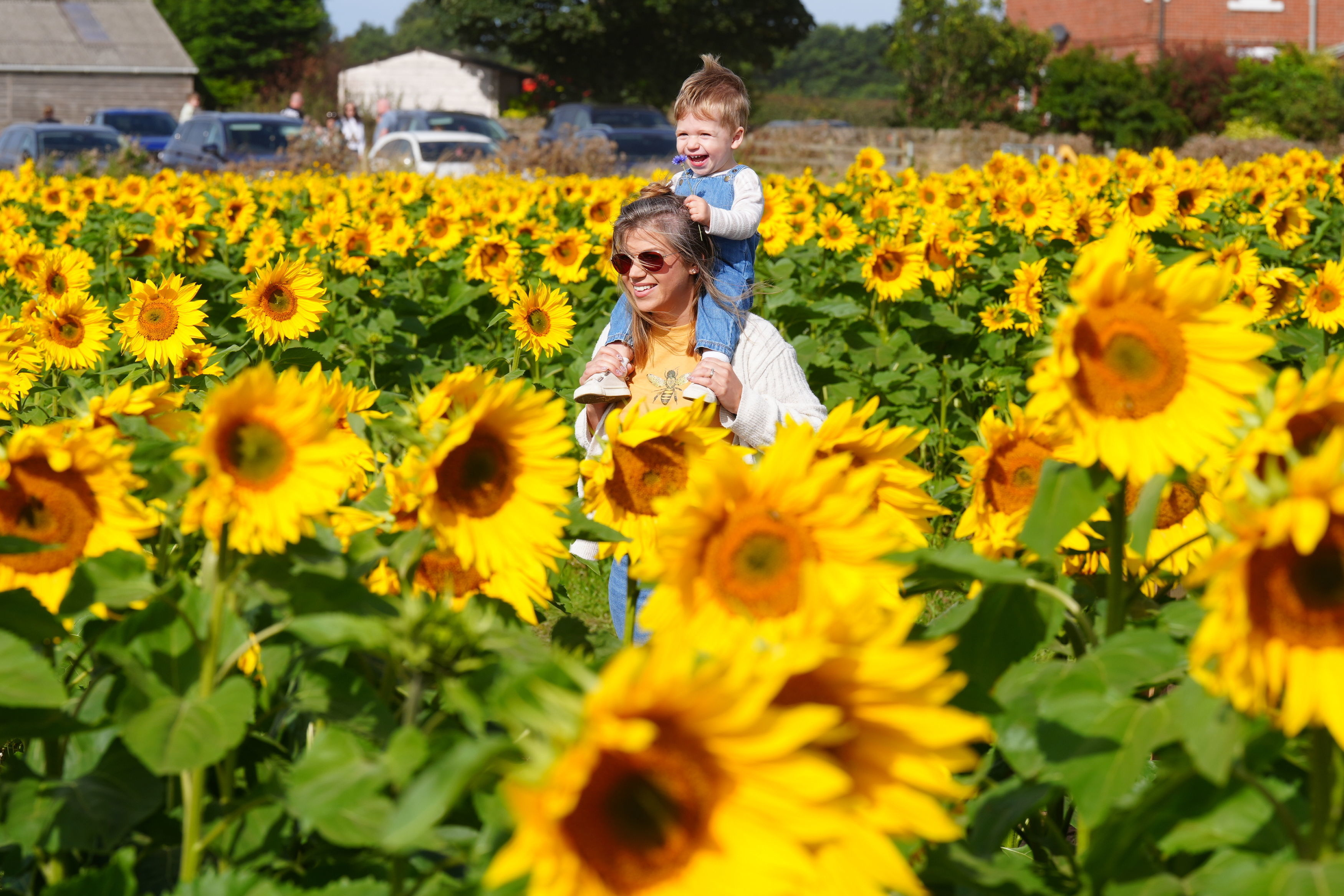 Ashley Speirs with Leo, (18 months old) look at the sunflowers at Mundles Farm in East Boldon, south Tynesde, UK on Sunday, August 25, 2024. (Photo by Owen Humphreys/PA Images via Getty Images)