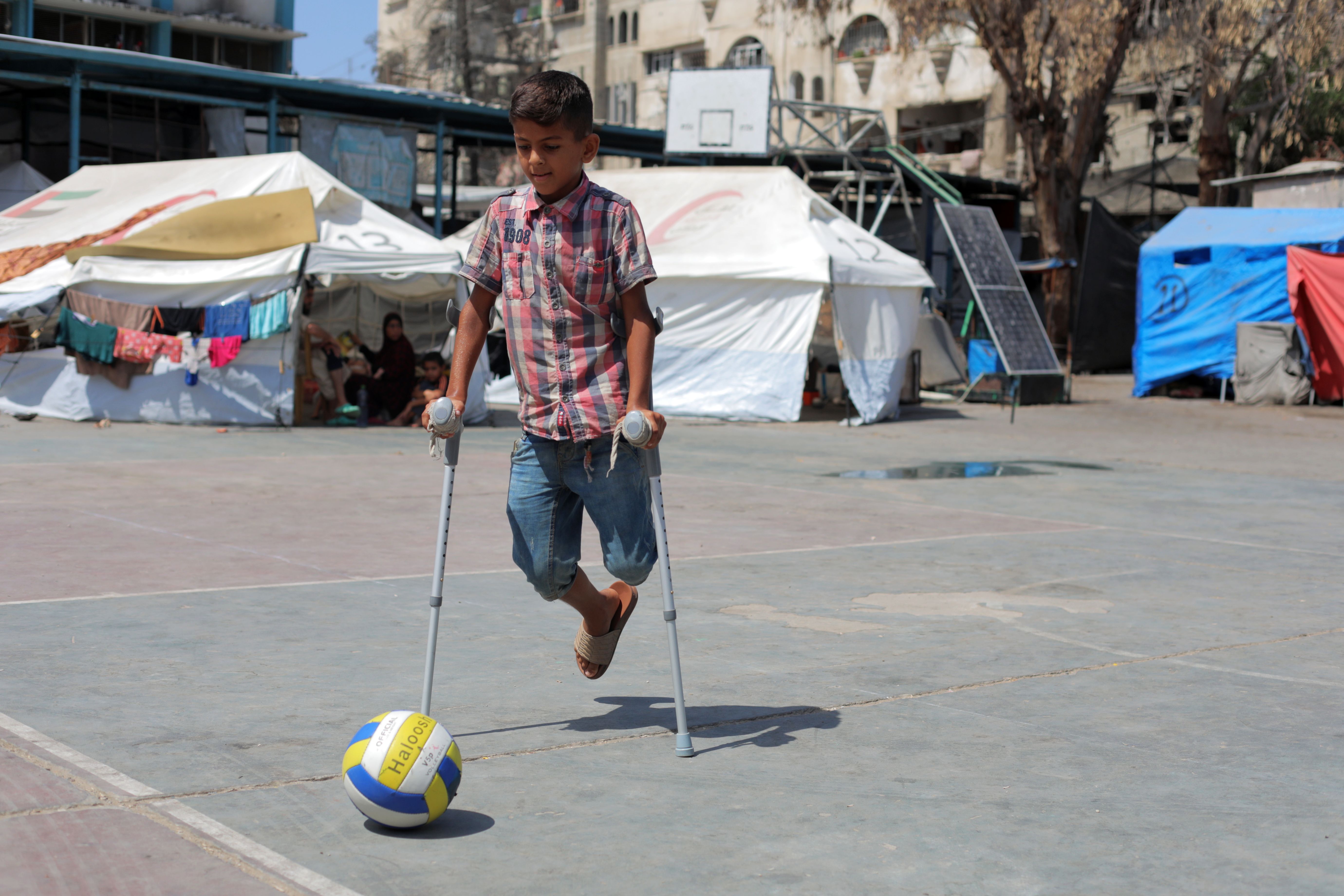 Abdurrahman El-Nashash, who lost a limb, is one of thousands of children who will not be able to attend school this year as Serdi School in Nuseirat Refugee Camp, severely damaged by Israeli attacks, now shelters many displaced Palestinians, on August 22, 2024 in Gaza City, Gaza. (Photo by Hassan Jedi/Anadolu via Getty Images)