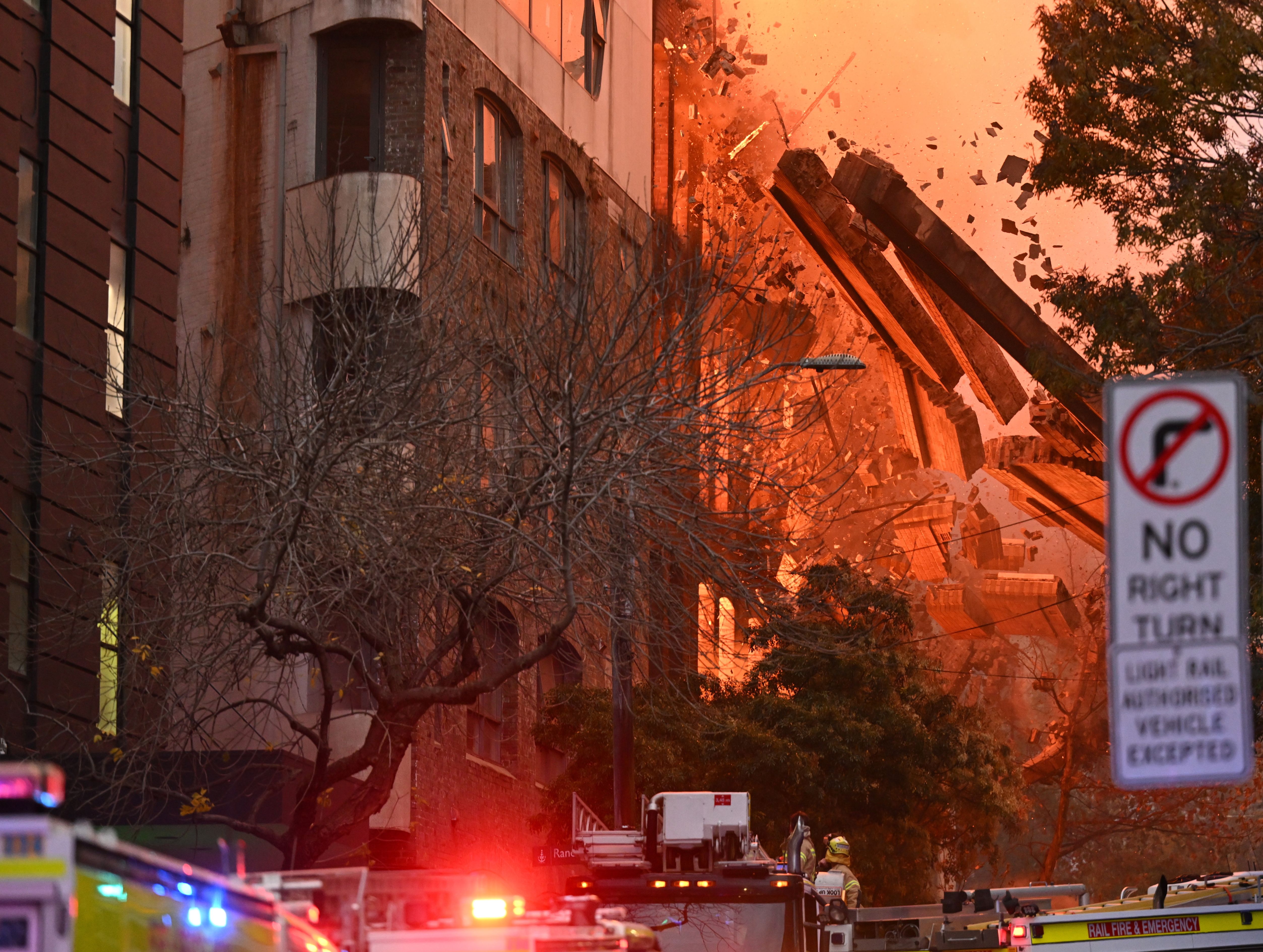 A wall collapses during a building fire in the Central Business District of Sydney, Australia, 25 May 2023. Fire and Rescue New South Wales said more than 100 firefighters were deployed to the area to battle the fire that erupted in the seven-storey building. (Photo by Dean Lewins/EPA)