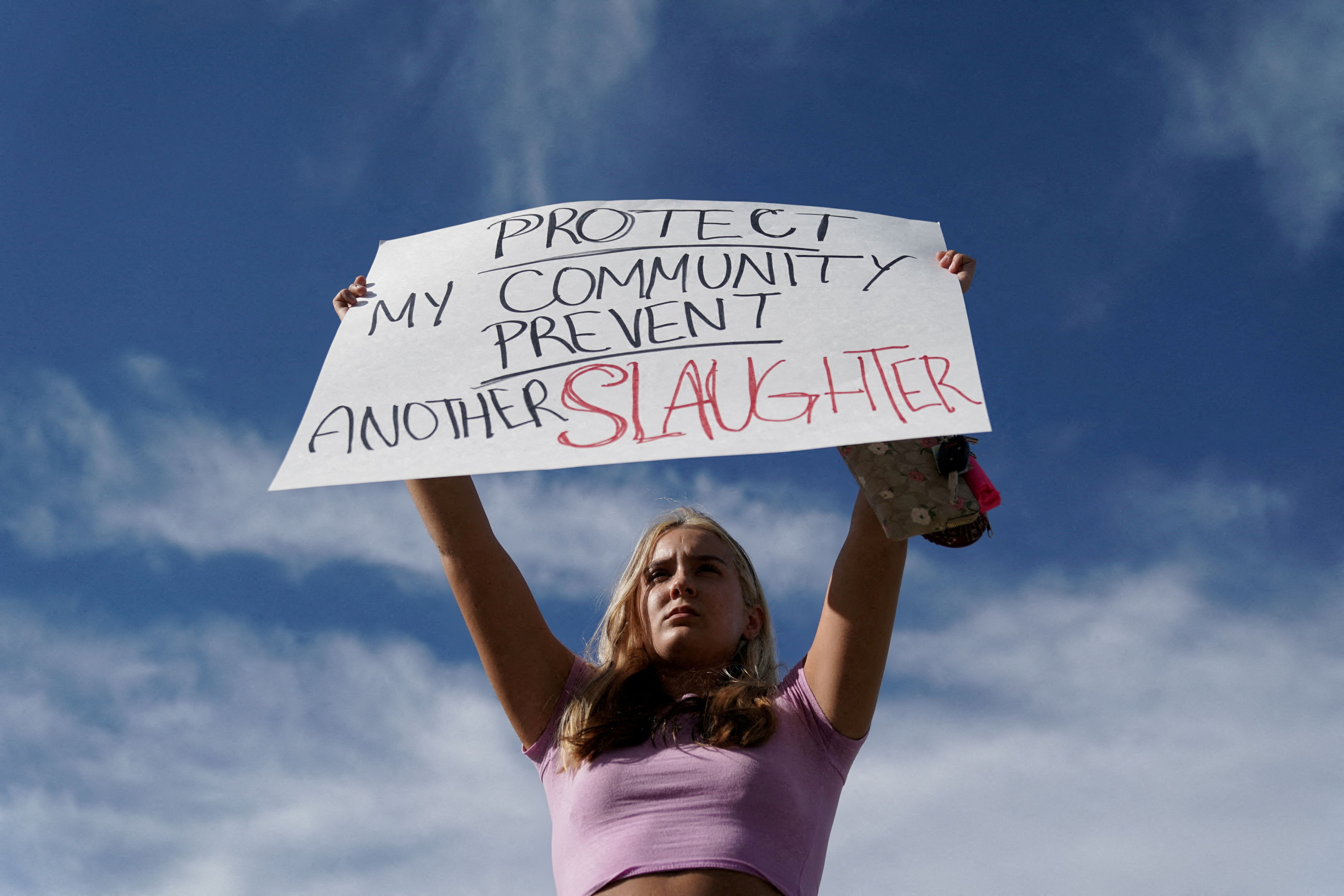 Student Gretchen Gierlach, 18, holds up a sign following a shooting at Apalachee High School in Winder, Georgia on September 4, 2024. (Photo by Elijah Nouvelage/Reuters)