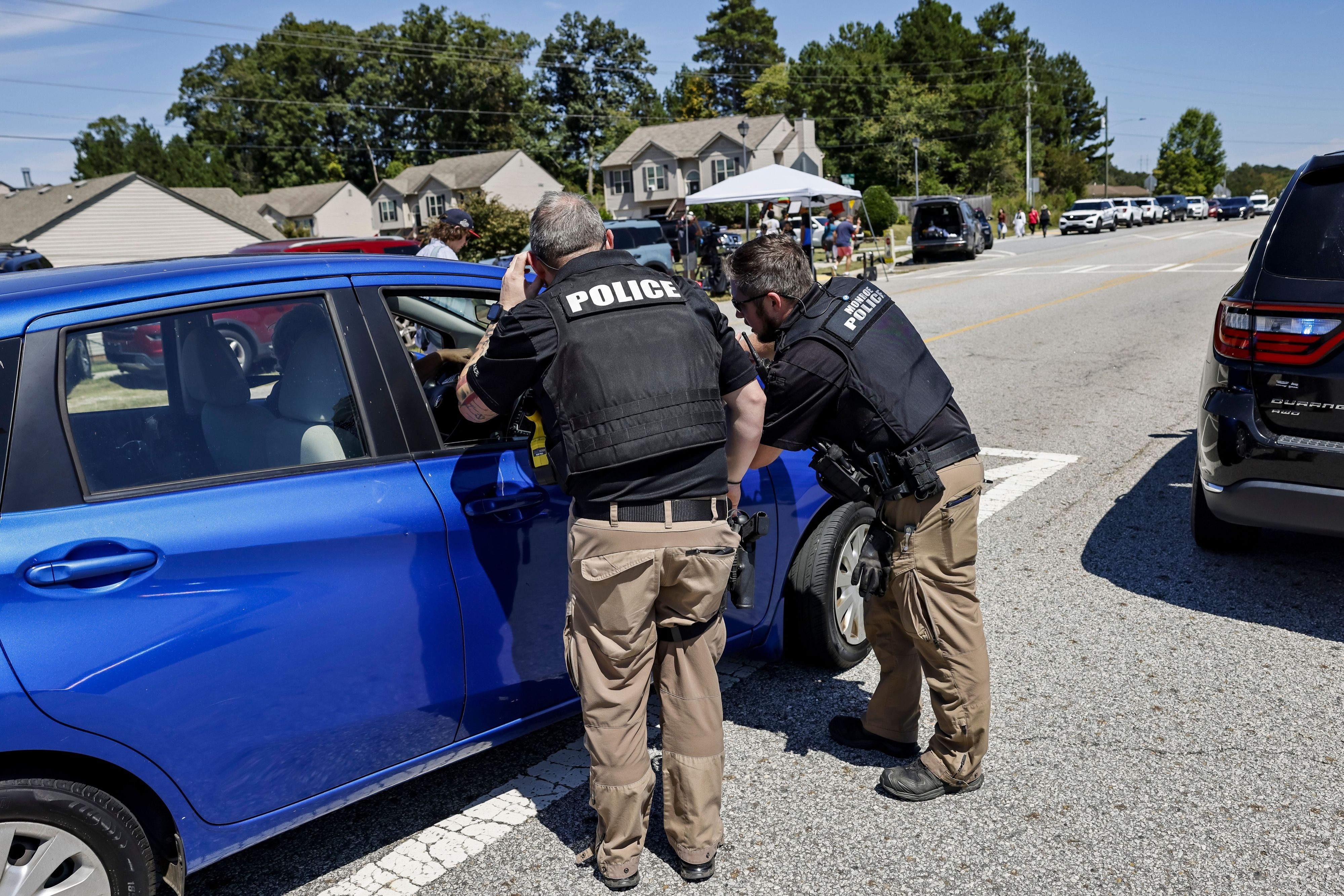 Police officers on the scene of a shooting at Apalachee High School in Winder, Georgia, USA, 04 September 2024. At least four people died and nine injured after a shooting at the school, the Georgia Bureau of Investigation (GBI) announced on social media platform X, formerly Twitter, adding that one suspect was in custody. (Photo by Erik S. Lesser/EPA/EFE)