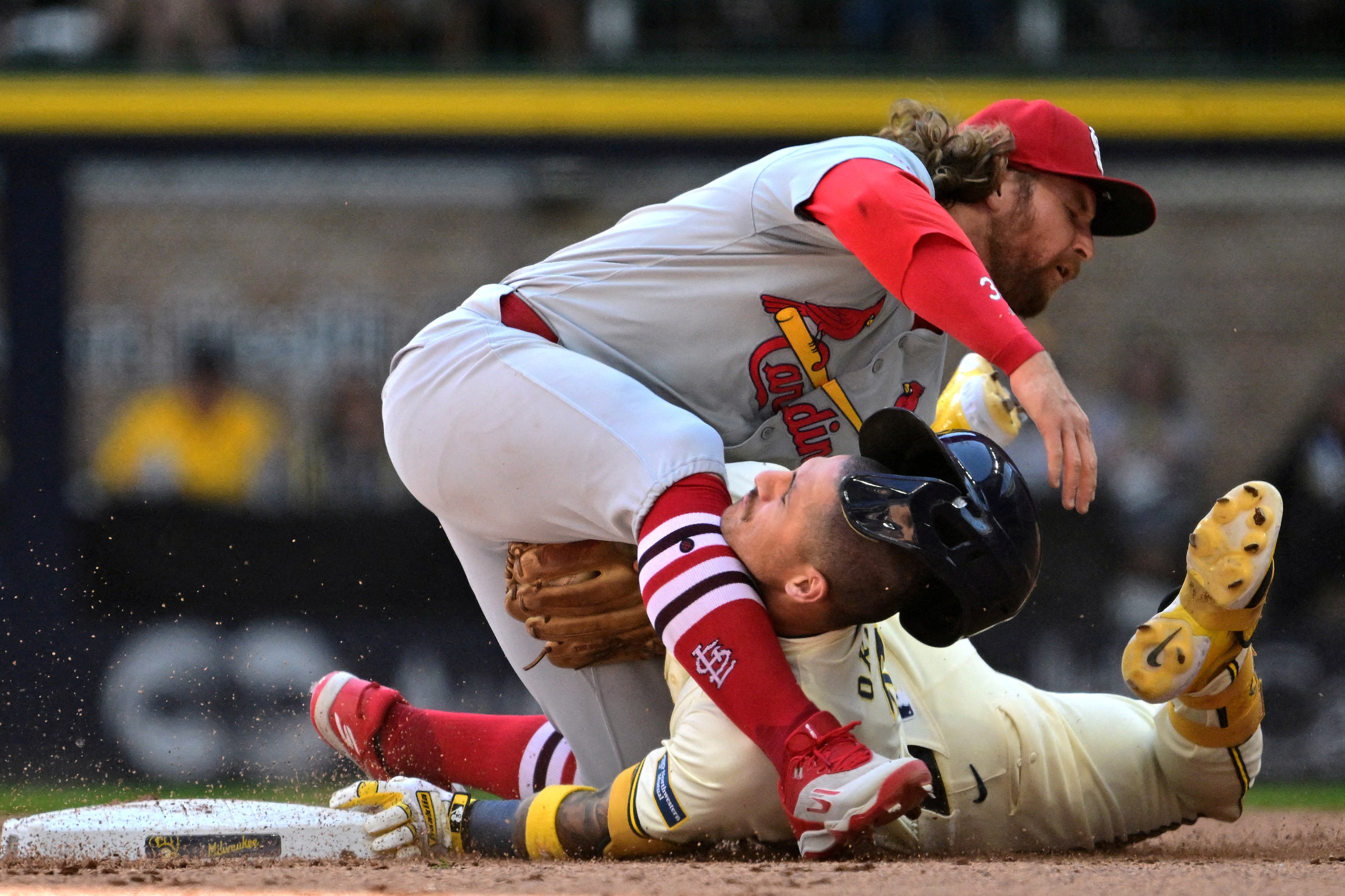 Brendan Donovan, St Louis Cardinals’ second baseman, tags out Joseph Ortiz, Milwaukee Brewers’ third baseman, at a baseball game in Milwaukee, Wisconsin on September 2, 2024. (Photo by Benny Sieu/Reuters)