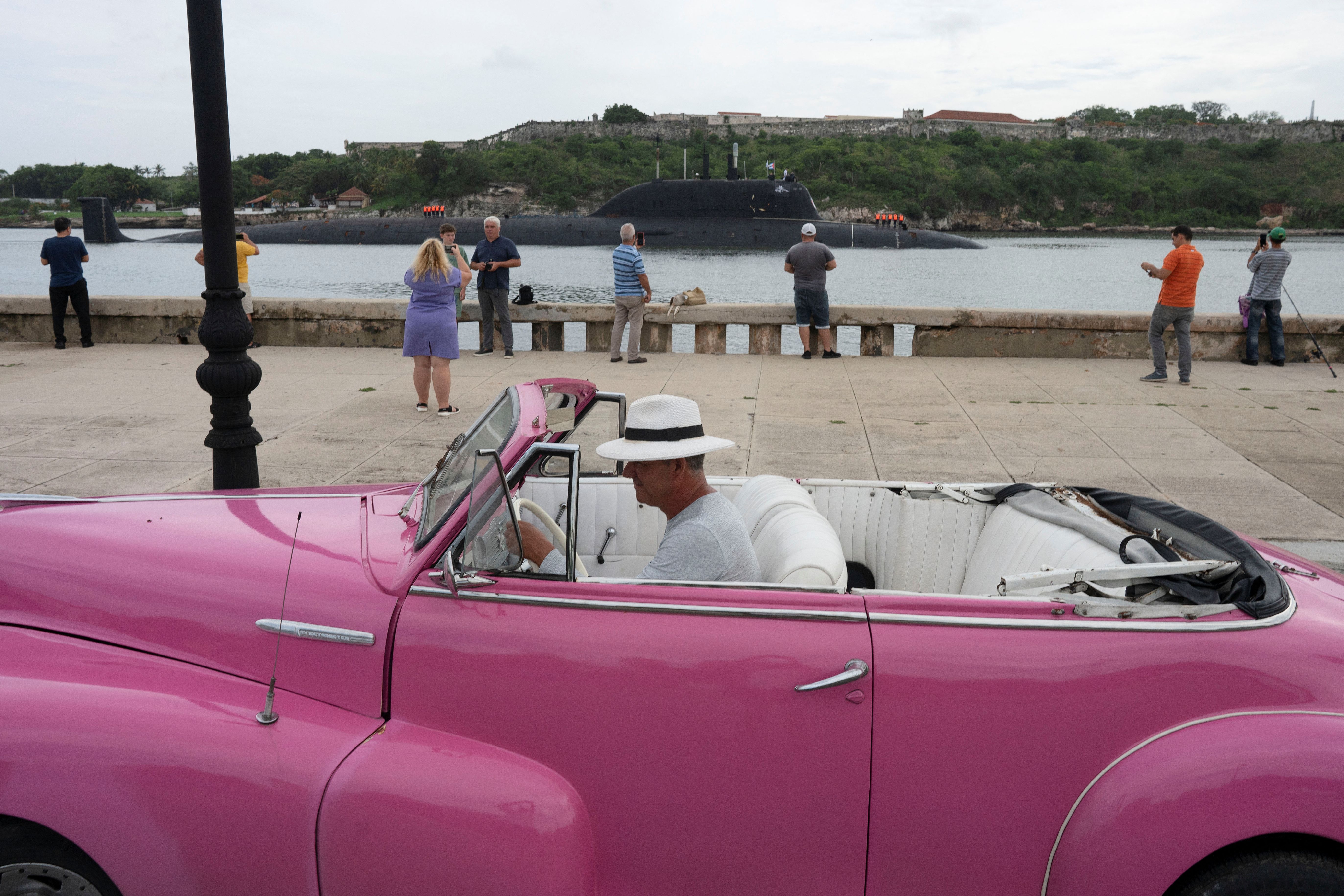 A driver parks a vintage car as Russian nuclear-powered cruise missile submarine Kazan enters Havana’s bay, Cuba, on June 12, 2024. (Photo by Alexandre Meneghini/Reuters)