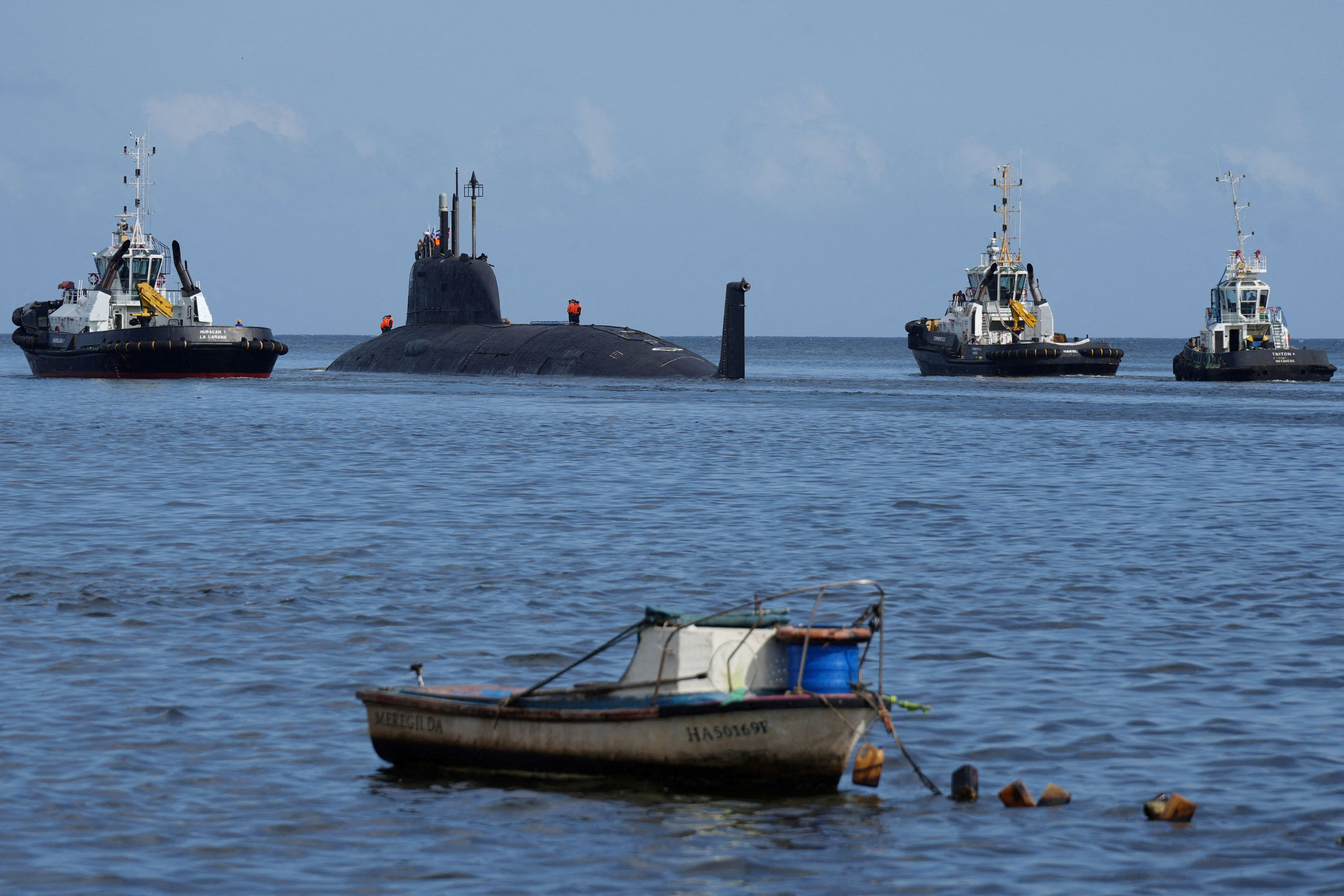 Russian nuclear-powered cruise missile submarine Kazan is escorted by tugboats as it departs from Havana's bay, Cuba, on June 17, 2024. (Photo by Alexandre Meneghini/Reuters)