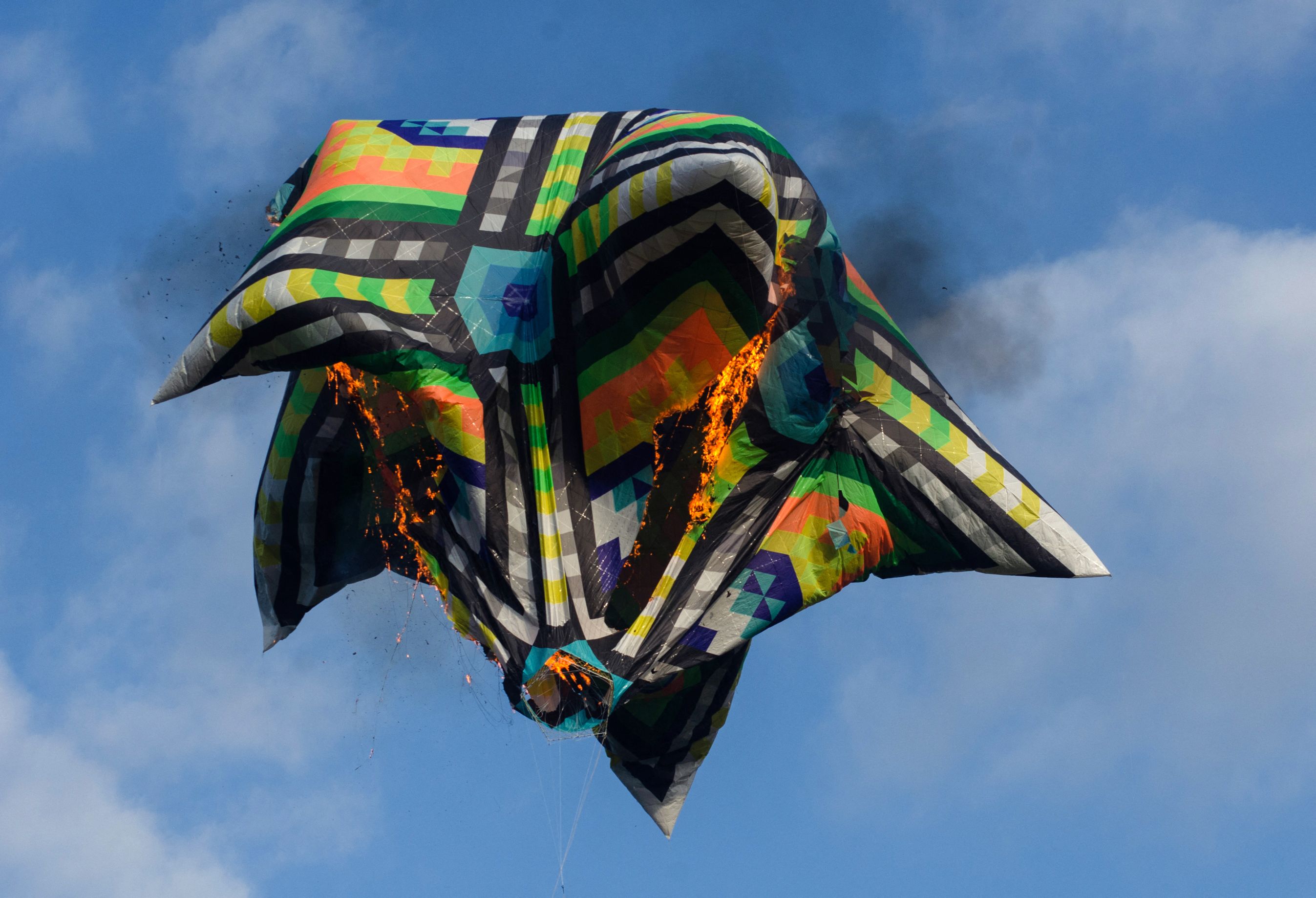 A hot air balloon flown by enthusiasts, without basket nor passengers, burns and falls to land during a tribute to mothers on Mother's Day, in Rio de Janeiro, Brazil, on May 14, 2023. (Photo by Tercio Teixeira/AFP Photo)