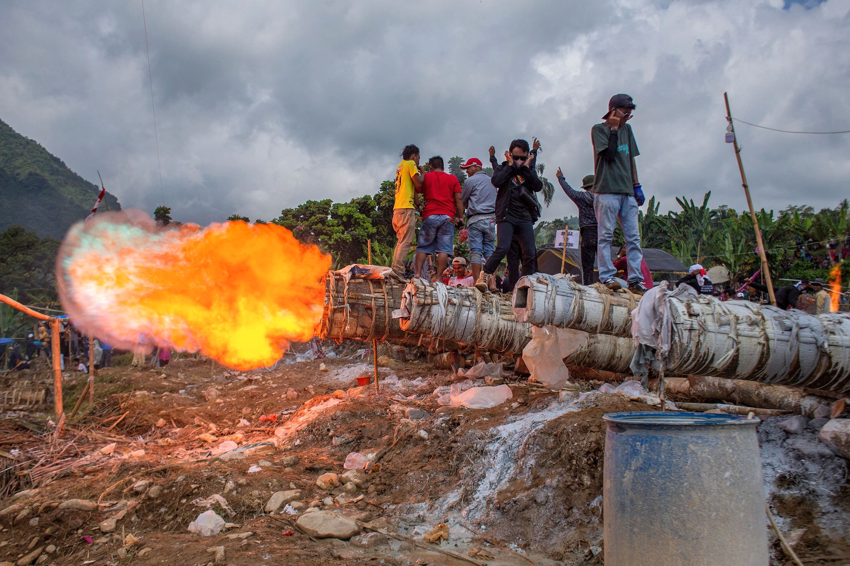 People fire traditional cannons during a festive event locally known as “Kuluwung”, which is held a few days after Eid al-Fitr, in Bogor, West Java on May 4, 2023. (Photo by Aditya Aji/AFP Photo)