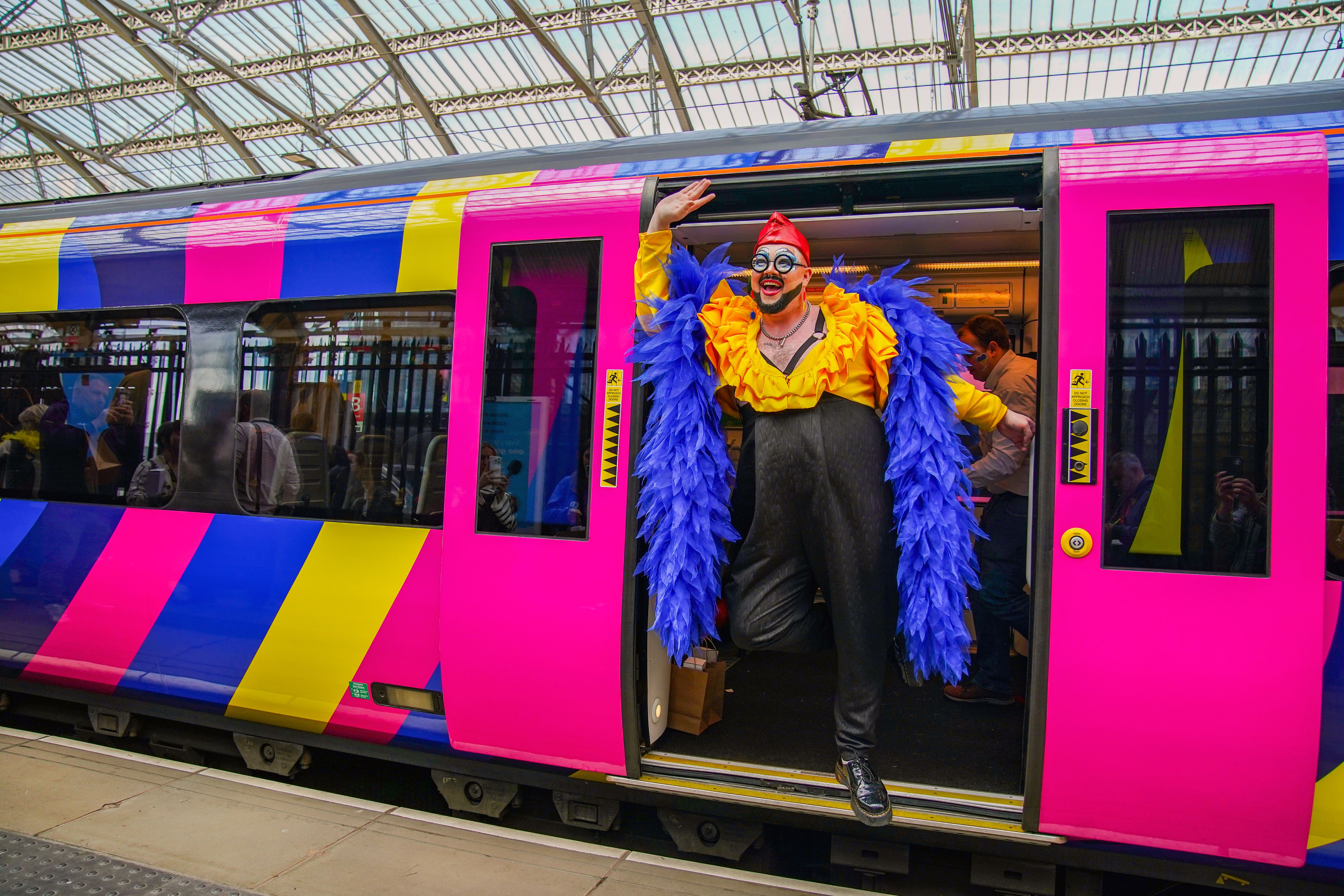 Two trains carrying 170 Eurovision song contest superfans are welcomed by drummers, drag queens, and dance troops as they arrive into Liverpool Lime Street train station on Tuesday, May 9, 2023. (Photo by Peter Byrne/PA Images via Getty Images)