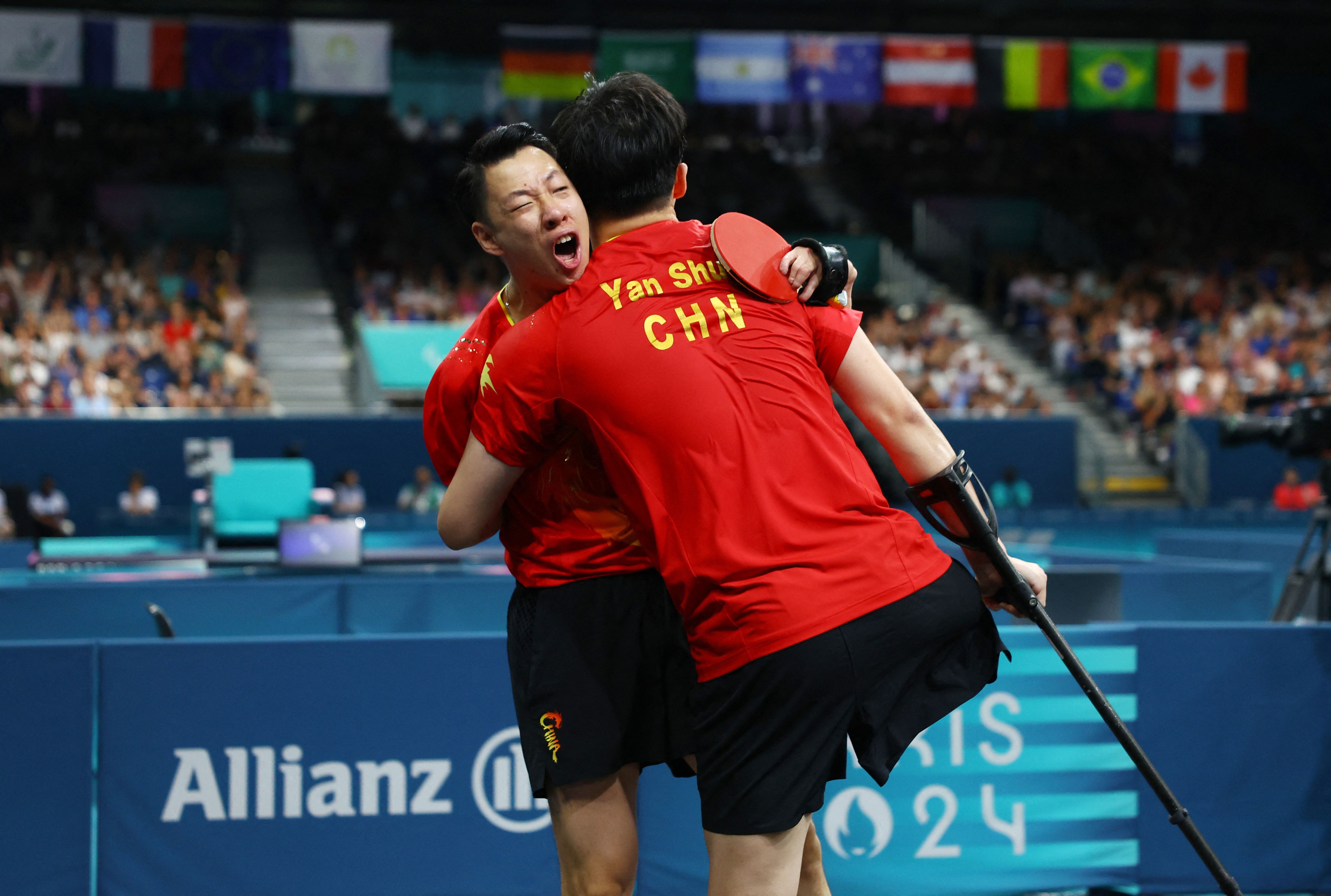 Keli Liao and Shuo Yan anof China celebrate after winning Para Table Tennis Men's Doubles - MD14 - Gold Medal Match Game 11 on day four of the Paris 2024 Summer Paralympic Games at South Paris Arena on September 01, 2024 in Paris, France. (Photo by Kacper Pempel/Reuters)