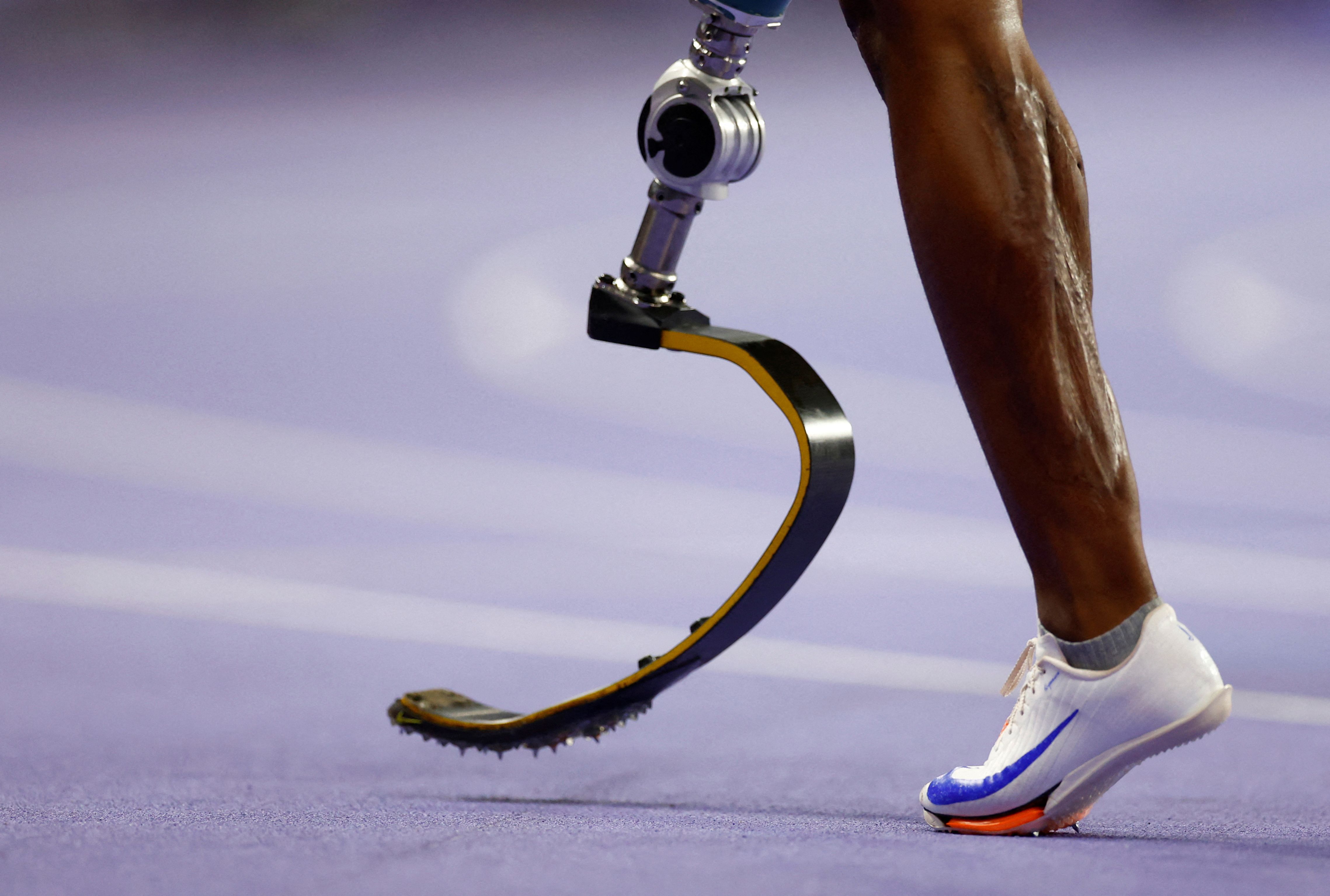 The running blade of Puseletso Michael Mabote of South Africa is pictured during the men's 100m T63 round 1 in Saint-Denis, France on September 1, 2024. (Photo by Stephanie Lecocq/Reuters)