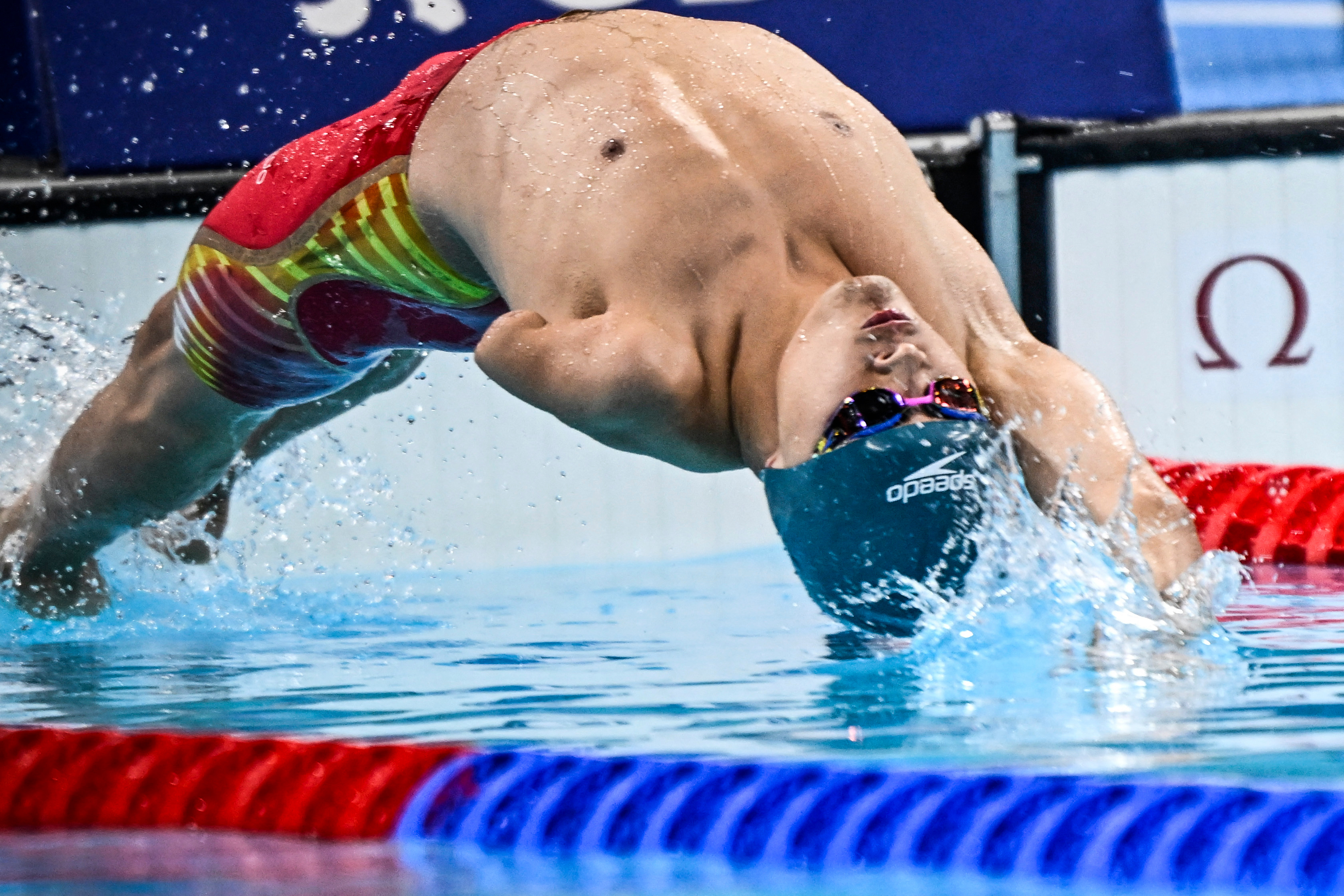 China’s athlete Fengqi Liu competes during the men's 100m backstroke - S8 final at the Paris 2024 Paralympic Games, in the Paris La Defense Arena, Nanterre, west of Paris, on August 31, 2024. (Photo by Julien de Rosa/AFP Photo)