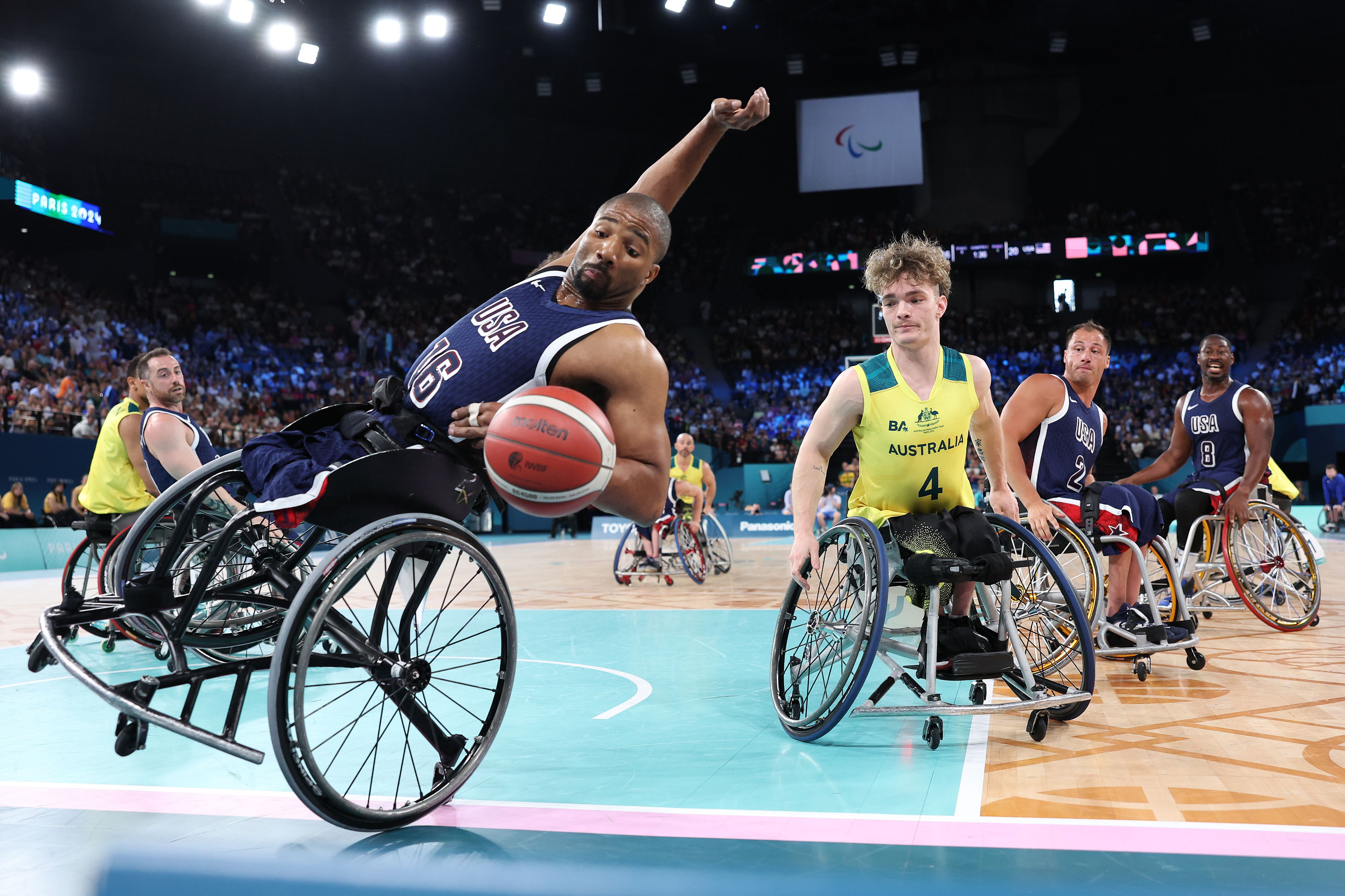 Trevon Jenifer of Team United States falls as Eithen Leard of Team Australia looks on during the Preliminary Round Group B match between Team Australia and Team United States on day four of the Paris 2024 Summer Paralympic Games at Bercy Arena on September 01, 2024 in Paris, France. (Photo by Michael Steele/Getty Images)