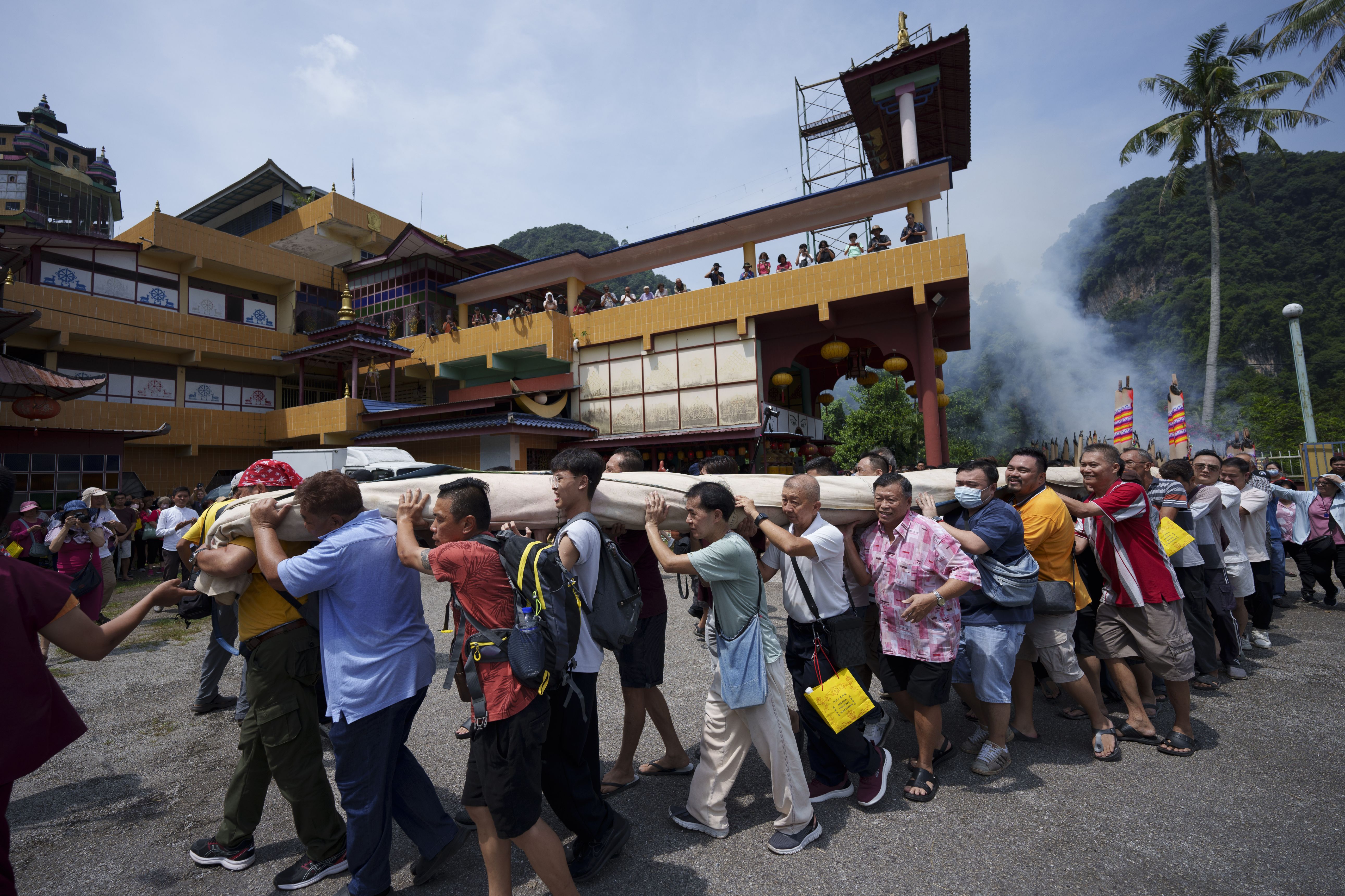 Devotees carries a giant canvas of sacred “Thangka” to display under the sun during Wesak day celebration in Ipoh, Malaysia, Wednesday, May 22, 2024. (Photo by Vincent Thian/AP Photo)