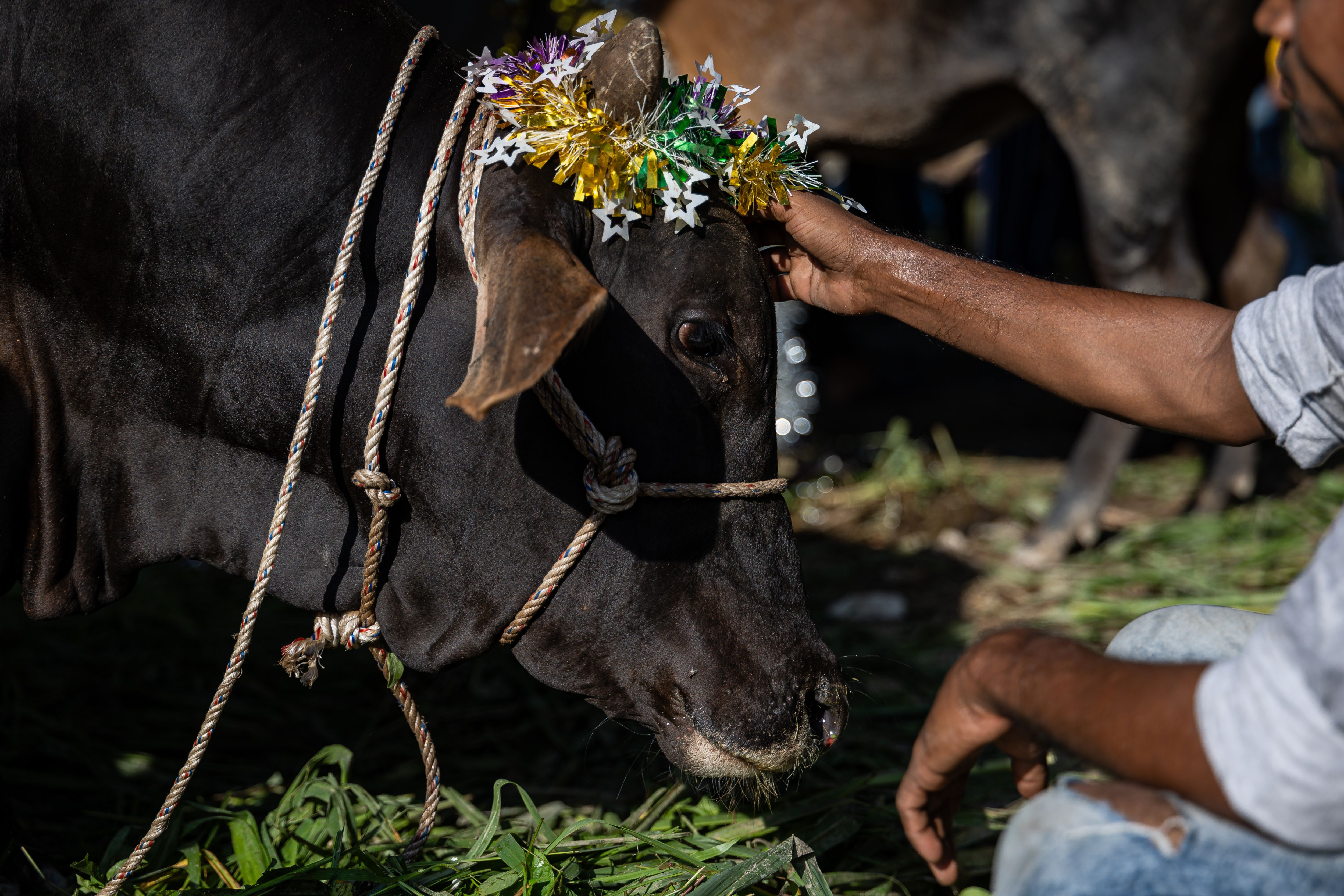 A sacrificial cow is prepared for slaughter as a sacrificial act during Eid al-Adha on June 17, 2024, in Kuala Lumpur, Malaysia. Muslims worldwide are celebrating Eid al-Adha to commemorate the Prophet Ibrahim's readiness to sacrifice his son as a sign of obedience to God, during which, they sacrifice permissible animals, generally goats, sheep, and cows. (Photo by Annice Lyn/Getty Images)